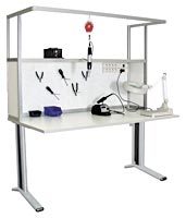 АКТАКОМ АРМ-4315-ESD стол слесаря-сборщика радиоаппаратуры с антистатической столешницей. Цвет алюминиевого каркаса - серый (RAL-9006), цвет ДСП - белый. Столешница размером 100х80 см из антистатического меламинированного ДСП толщиной 25 мм. Одна углубленная полка 100x30 см над столешницей. Разъемы заземления. 2-х уровневое освещение из 2 светодиодных светильников по 10 Вт. Кронштейн-штанга по всей ширине стола. Перфорированная задняя стенка, набор крючков для крепления инструмента. Блок из 8 розеток с выключателем. Высота 171 см.