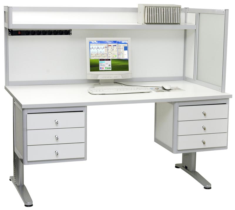 АКТАКОМ АРМ-4415-ESD стол инженера/менеджера c антистатической столешницей. Цвет алюминиевого каркаса - серый (RAL-9006), цвет ДСП - белый. Столешница размером 100х80 см из антистатического меламинированного ДСП толщиной 25 мм. Перегородка высотой 60 см правосторонняя (левосторонняя - по заказу). Одна полка 100x20 см над столешницей. Освещение: светодиодный светильник 10 Вт. Блок из 8 розеток с выключателем, разъемы заземления. Высота 134 см.