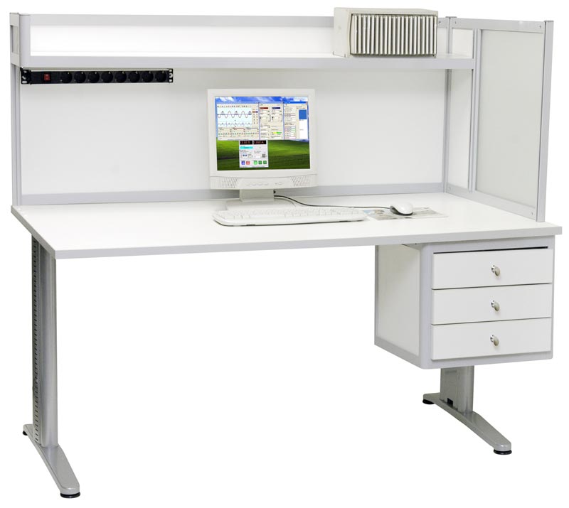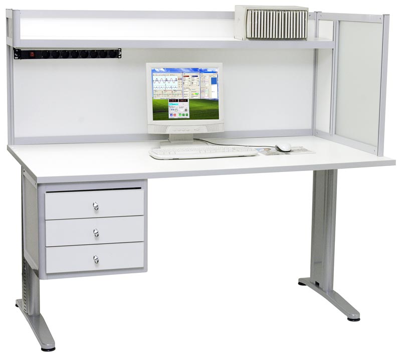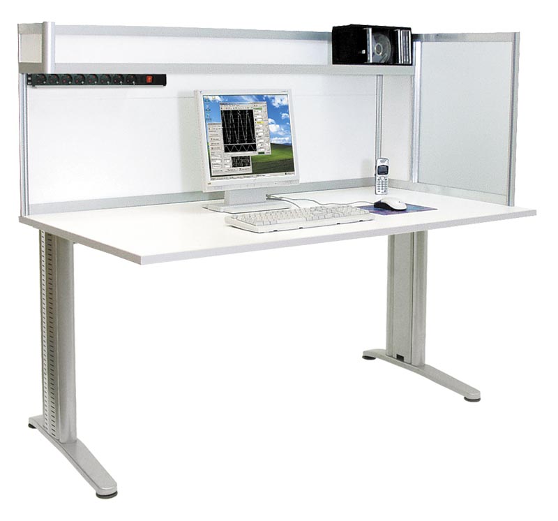 Стол инженера/менеджера. Цвет алюминиевого каркаса - серый (RAL-9006), цвет ДСП - белый. Столешница 120x80 см. Перегородка высотой 60 см правосторонняя (левосторонняя - по заказу). Одна полка 120x20 см над столешницей. Освещение: 2 светодиодных светильника по 8 Вт. Блок из 8 розеток с выключателем. Высота 134 см.