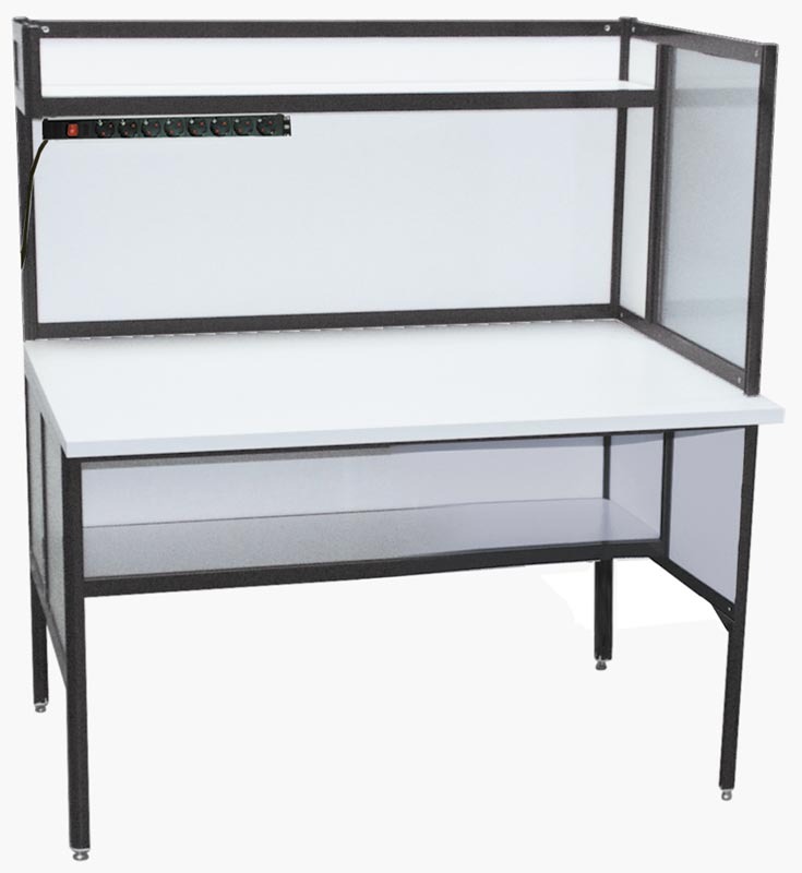 Стол инженера/менеджера с перегородкой 150х80х134 см. Цвет алюминиевого каркаса - серый (RAL-9006), цвет ДСП - белый. Полка 150х30 см под столешницей. Перегородка угловая 60 см право(лево)сторонняя, с полкой. Освещение: 2 светодиодных светильника по 10 Вт, блок из 8 розеток с выключателем. Расстояние от столешницы до пола 750 мм с регулировкой опорами +10 мм.