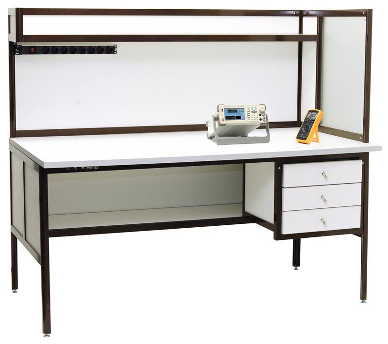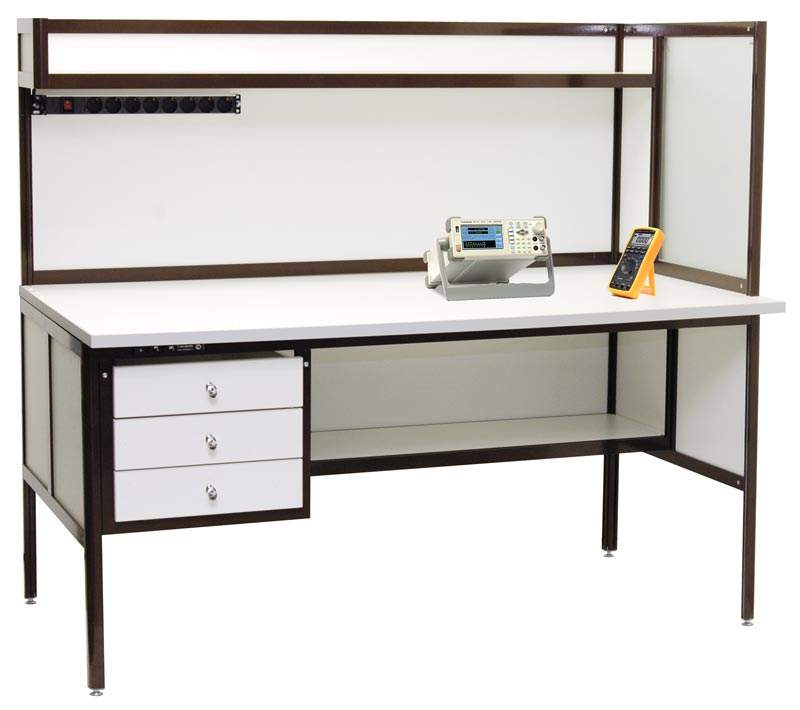 АКТАКОМ АРМ-4450-ESD стол инженера/менеджера с перегородкой и с антистатической столешницей 150х80х134 см. Цвет алюминиевого каркаса - коричневый (RAL-8017), цвет ДСП - белый. Столешница размером 150х80 см из антистатического меламинированного ДСП толщиной 25 мм. Полка 150х30 см под столешницей. Перегородка угловая 60см, с полкой. Освещение: 2 светодиодных светильника по 10 Вт, блок из 8 розеток с выключателем, разъемы заземления.