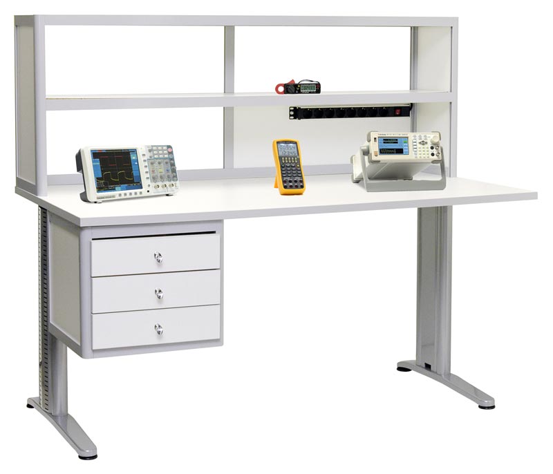 АКТАКОМ АРМ-4515-ESD стол метролога с антистатической столешницей. Цвет алюминиевого каркаса - серый (RAL-9006), цвет ДСП - белый. Столешница размером 100х80 см из антистатического меламинированного ДСП толщиной 25 мм. Две полки 100 x 30 см над столешницей без задней стенки. Разъемы заземления. Блок из 8 розеток с выключателем. Высота 131 см.