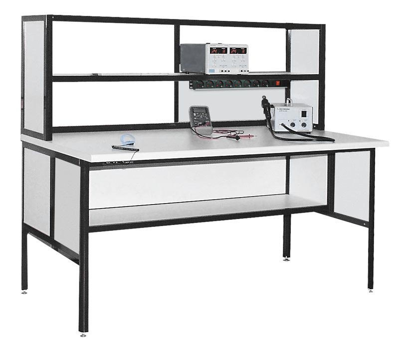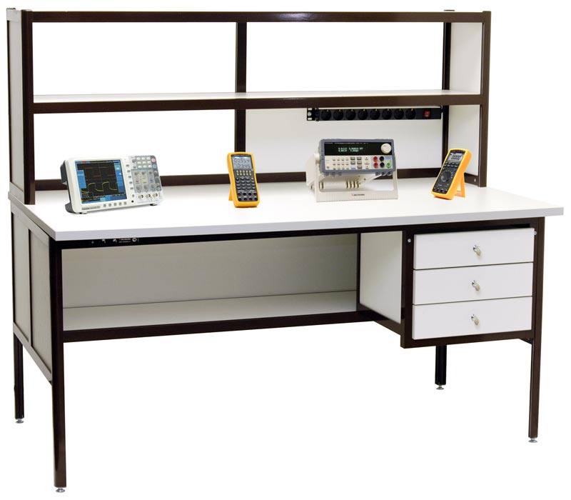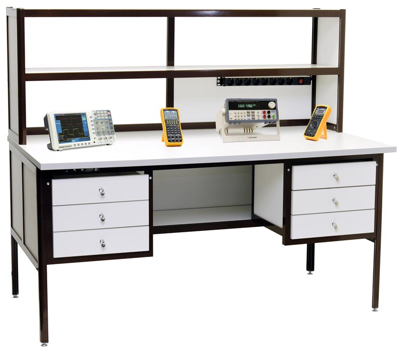 Стол метролога 150 x 80 х 131 см. Цвет алюминиевого каркаса - коричневый (RAL-8017), цвет ДСП - белый. Две полки 150 x 30 см без задней стенки над столешницей. Полка 150х30 см с задней стенкой под столешницей. Блок из 8 розеток с выключателем, разъемы заземления.