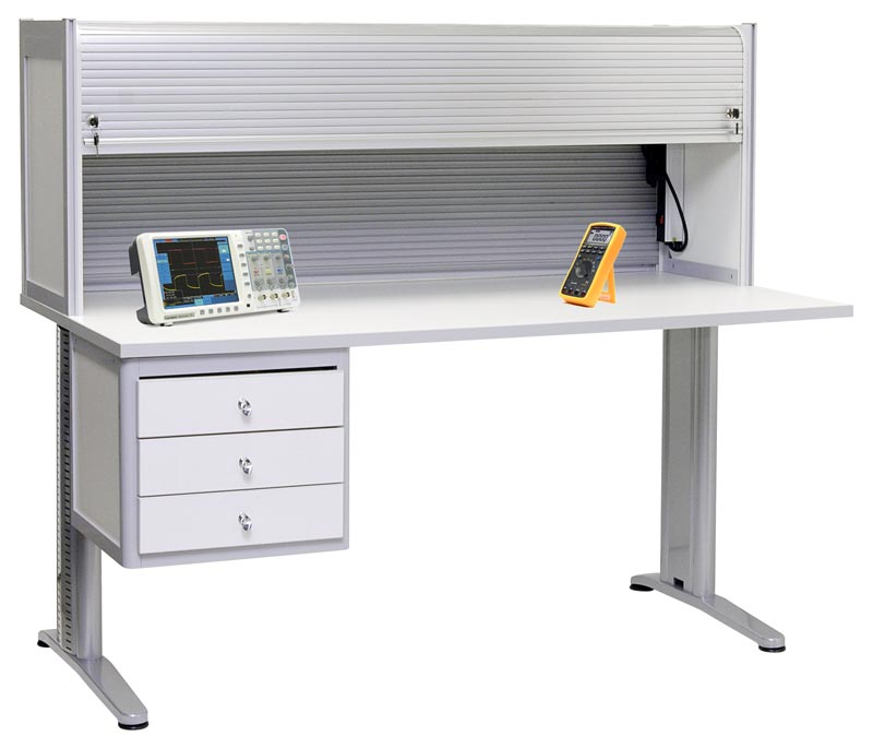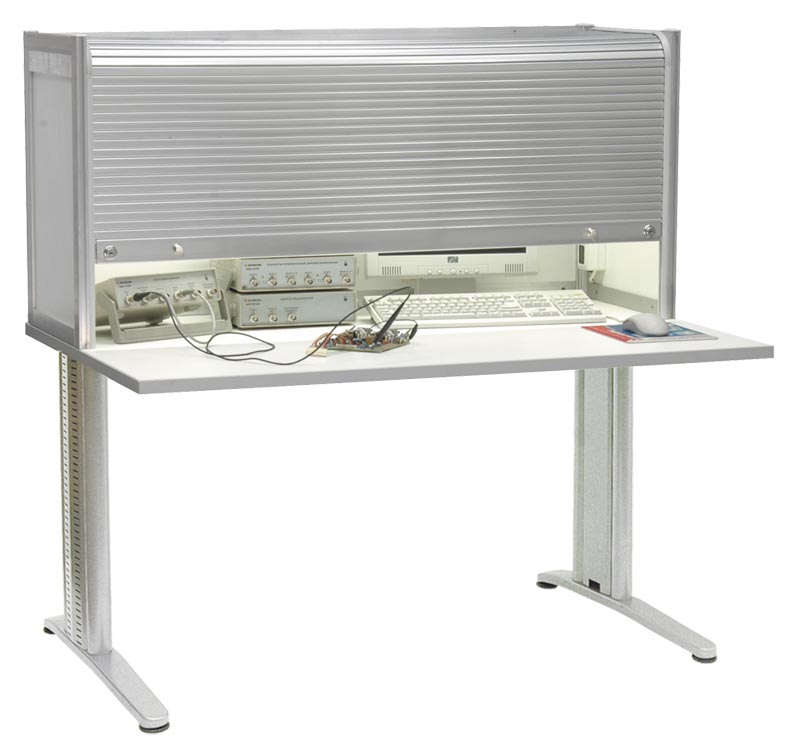Стол-бюро150x80х131 см. Цвет алюминиевого каркаса - серый (RAL-9006), цвет ДСП - белый. Подвижная система жалюзей с двумя замками. Разъемы заземления. Освещение из 2 светодиодных светильников по 10 Вт. Блок из 6 розеток с выключателем. Высота изделия 131 см.