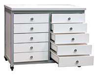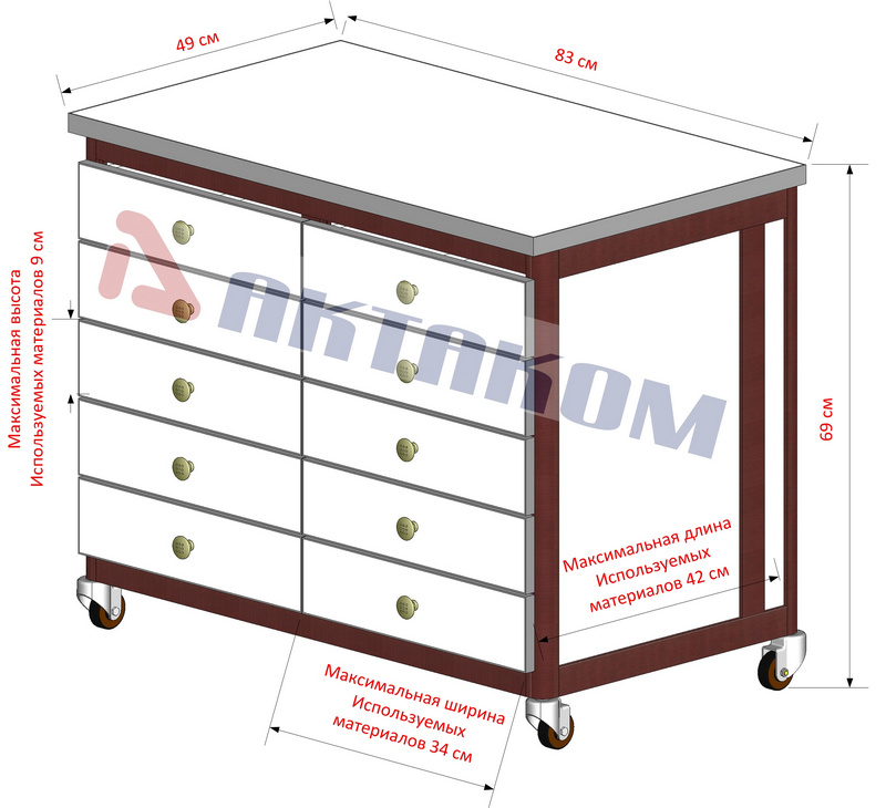 Тумбочка подкатная (шхгхв) 84х50х69 см. Цвет алюминиевого каркаса - коричневый (RAL-8017), цвет ДСП - белый. Четыре колеса на резиновом ходу без блокировки. Десять ящиков 33х40х8 см, с лицевыми панелями.