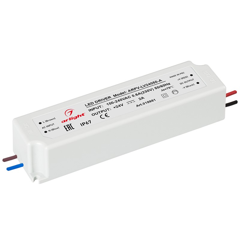 Источник напряжения с гальванической развязкой для светодиодных изделий. Входное напряжение 100-240 VAC. Выходные параметры: 24 В, 2 А, 48 Вт. Встроенный PFC >0,5. Герметичный пластиковый корпус IP 67. Рабочая температура -20…+50C⁰. Габаритные размеры длина 162 мм, ширина 42 мм, высота 34 мм. Гарантийный срок 3 года.