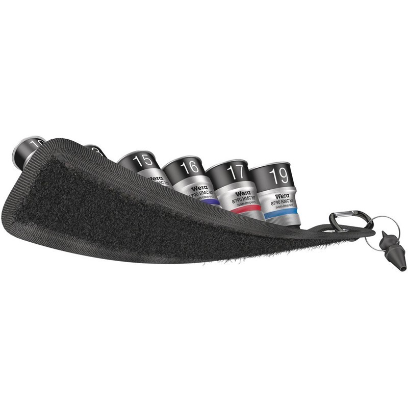 Typically Wera designed robust textile belt with 6 sockets taking up minimal space. A smooth Twist to Unlock mechanism ensures a secure fit and simple removal of the sockets. Comes with “Take it easy” Tool Finder with colour coding according to size to enable the right tool to be selected easily and quickly. Includes a snap hook for secure fastening to a belt loop or pocket. Sockets with holding function for particularly convenient screwdriving with reduced risk of losing the screw when approaching the workpiece. Supplied with a non-woven reverse side and hook and loop strips for simple attachment e.g. to a wall, shelf, tool trolley and to the Wera 2go tool transport system.