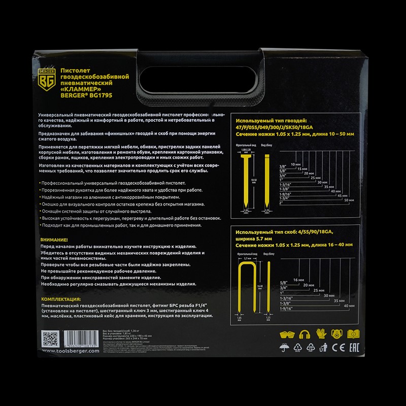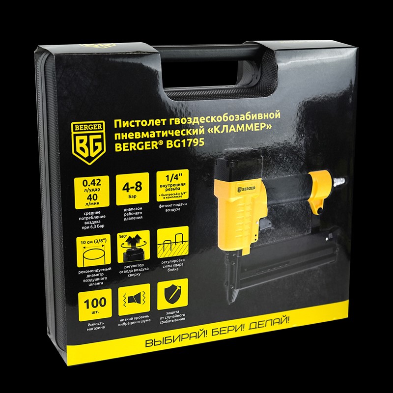 Универсальный пневматический гвоздескобозабивной пистолет BERGER BG1795 профессионального качества, надёжный и комфортный в работе, простой и нетребовательный в обслуживании.