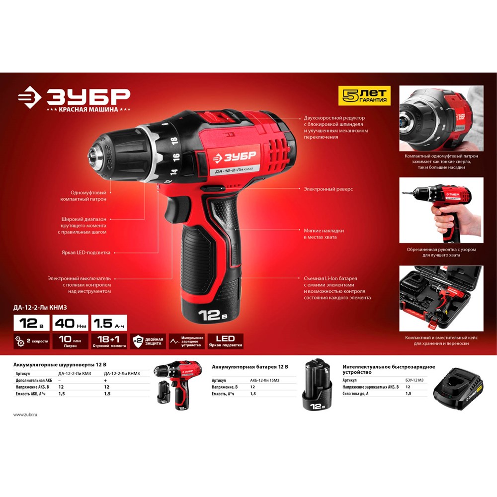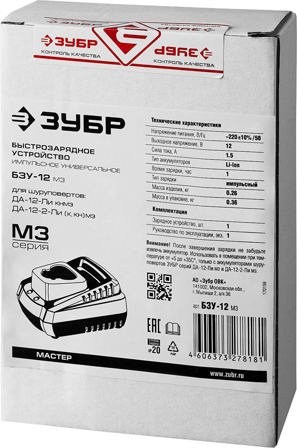 Зарядное устройство ЗУБР БЗУ-12 М3, предназначено для зарядки аккумуляторных батарей шуруповертов ЗУБР серии ДА-12-2-Ли. Более глубокий заряд позволяет использовать 100% емкости. Высокий КПД. Более щадящая зарядка аккумулятора, меньше нагрев. Электронная диагностика состояния АКБ. Контроль степени заряда и температуры. Автоматическое отключение по окончании зарядки или при неисправности АКБ. Защита от повреждений зарядного устройства и аккумулятора. Защита от перепадов напряжения в сети, от короткого замыкания, от переполюсовки контактов. Светодиодная индикация процесса зарядки.