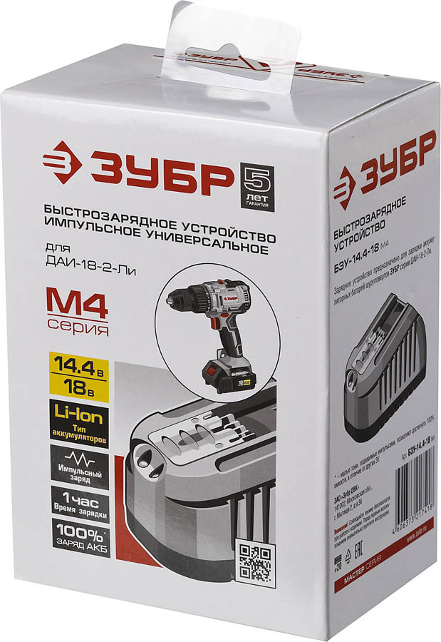 Зарядное устройство ЗУБР БЗУ-14.4-18 М4, предназначено для зарядки аккумуляторных батарей шуруповертов ЗУБР серии ДАИ-18-2-Ли. Более глубокий заряд позволяет использовать 100% емкости. Высокий КПД. Более щадящая зарядка аккумулятора, меньше нагрев. Электронная диагностика состояния АКБ. Контроль степени заряда и температуры. Автоматическое отключение по окончании зарядки или при неисправности АКБ. Защита от повреждений зарядного устройства и аккумулятора. Защита от перепадов напряжения в сети, от короткого замыкания, от переполюсовки контактов. Светодиодная индикация процесса зарядки.
