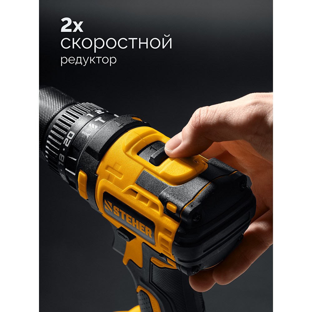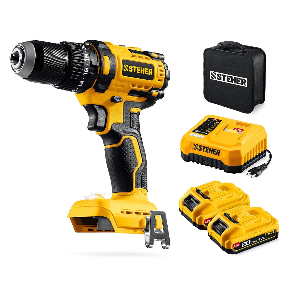 STEHER 20 В, 65 Н·м, 2 АКБ LMS (2 А·ч), бесщеточная ударная дрель-шуруповерт, сумка (CBS-65-22)