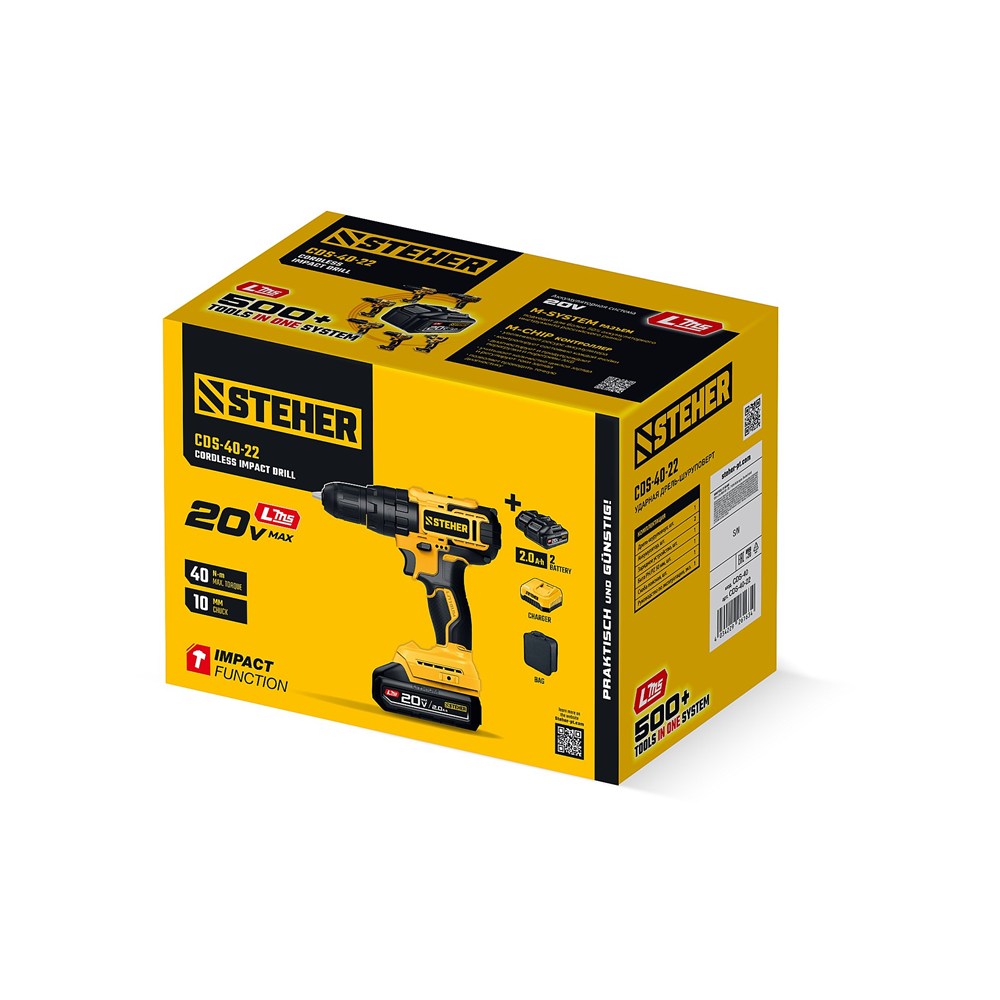 STEHER 20 В, 40 Н·м, 2 АКБ LMS (2 А·ч), ударная дрель-шуруповерт, сумка (CDS-40-22)