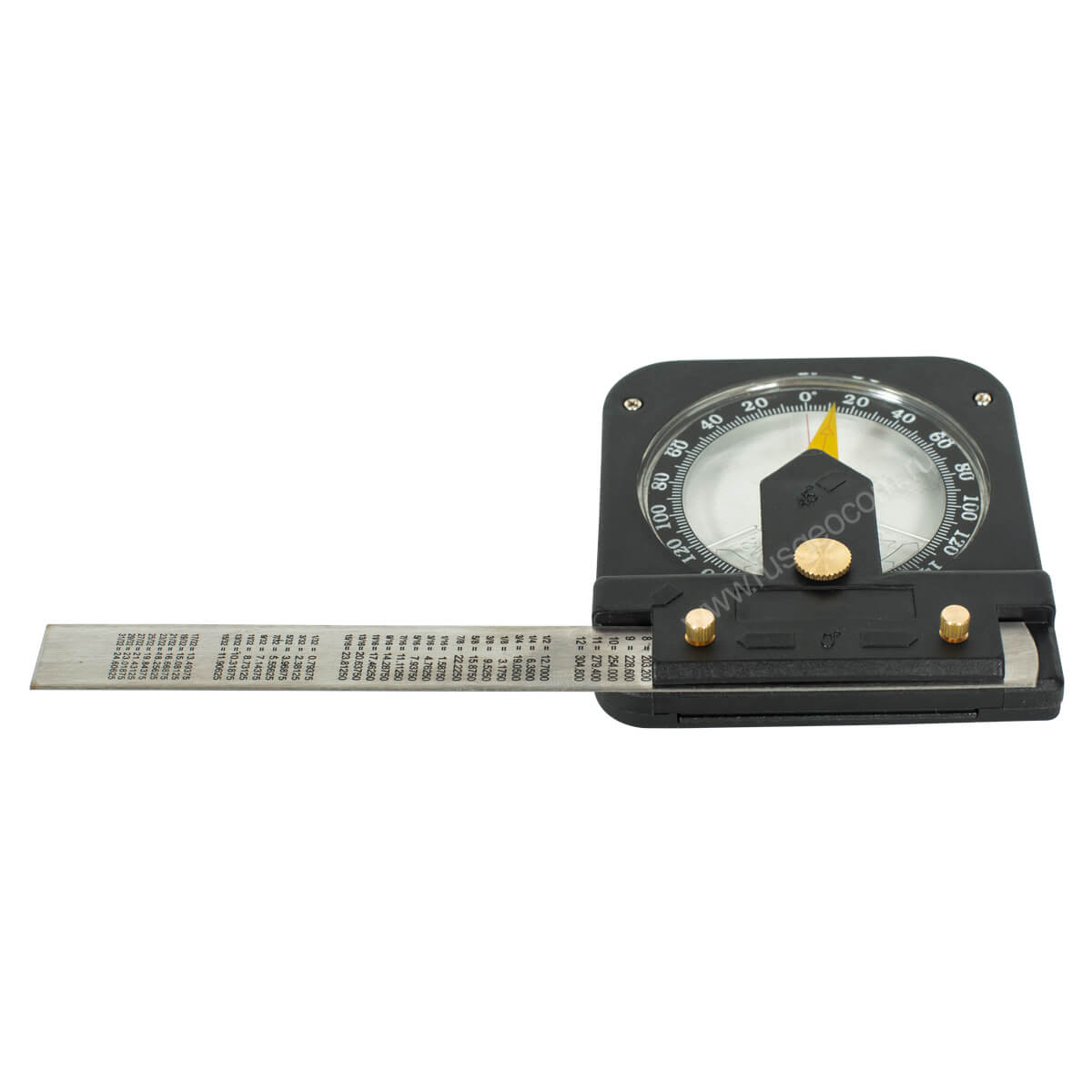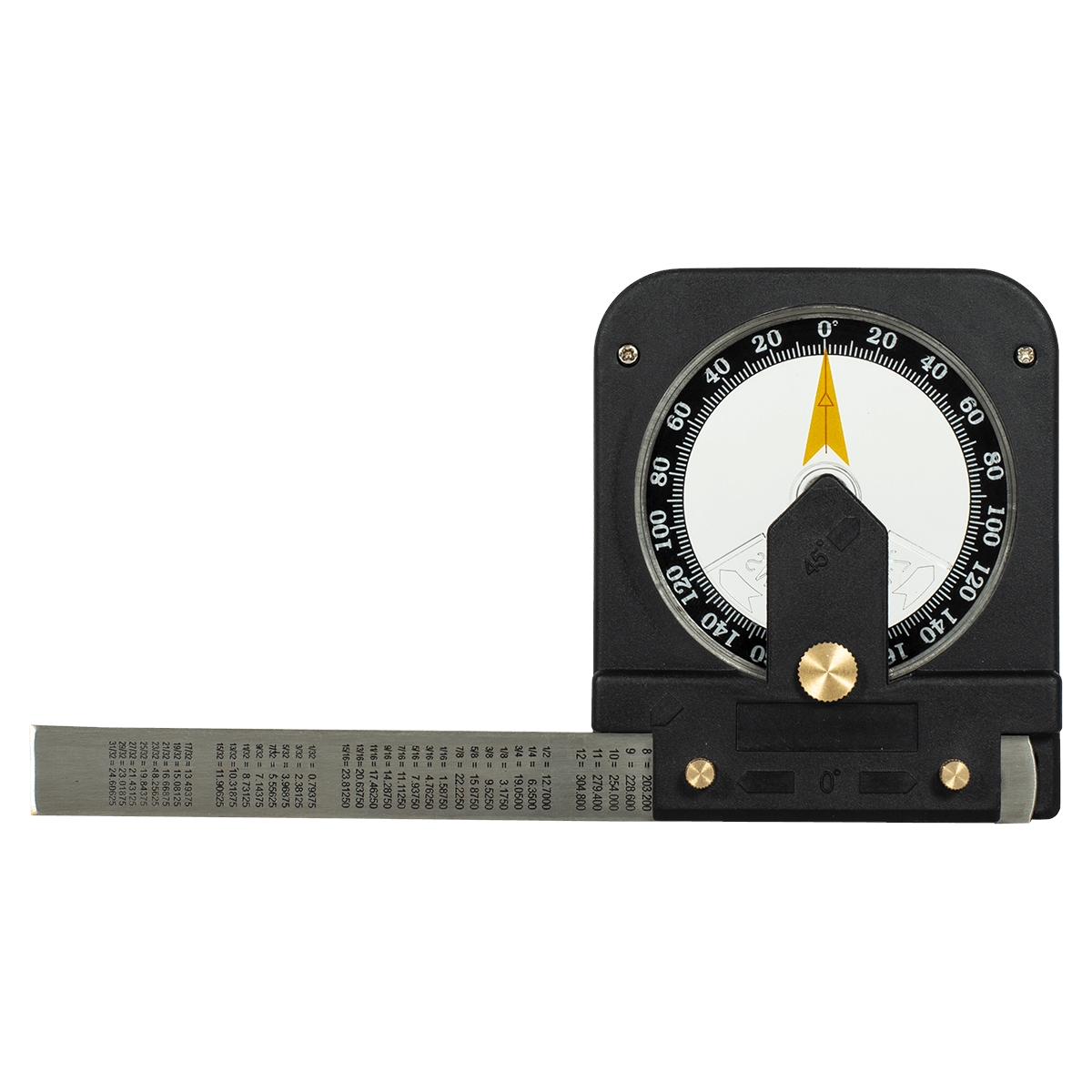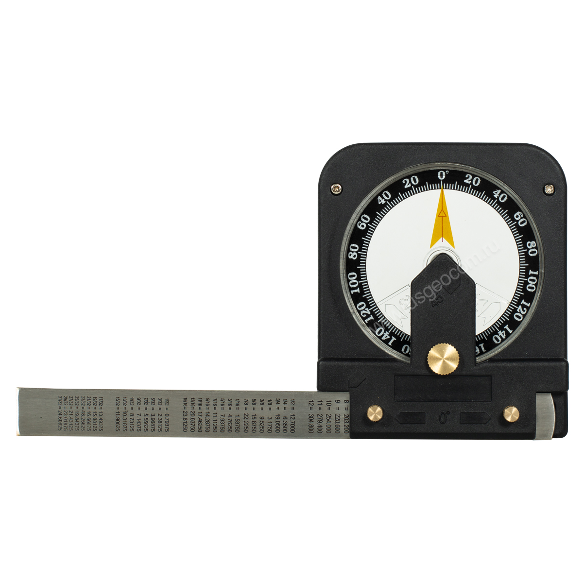 Прозрачный элемент подвижной рабочей части размещен в пластиковом корпусе, грани которого сходятся под прямым углом, позволяя использовать устройство в качестве угольника. Приблизительные/оценочные измерения выполняются по шкале с обратной стороны корпуса, цена деления которой составляет 2°. На лицевой части нанесена круговая градусная разметка с делениями через 1°. Дополнительная нониусная шкала дает возможность определять величину вертикальных углов с разрешением до 0,1° в пределах до 120 градусов. Сдвоенные кольцевые деления исключают ошибку при визуальном считывании показаний.
