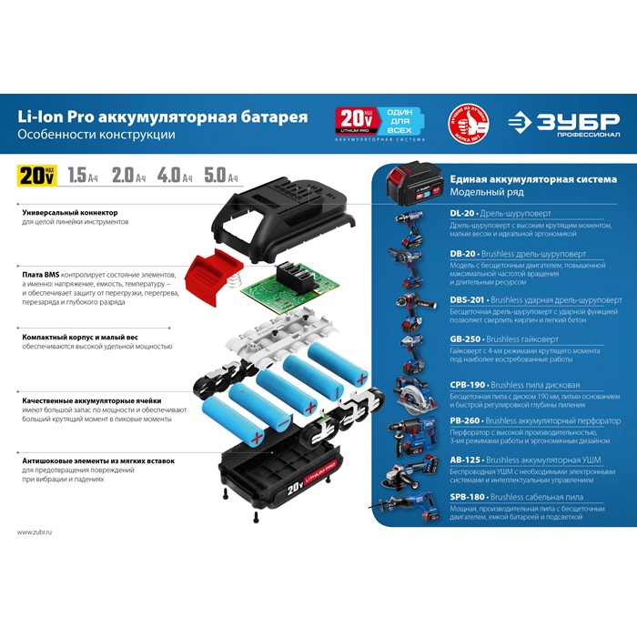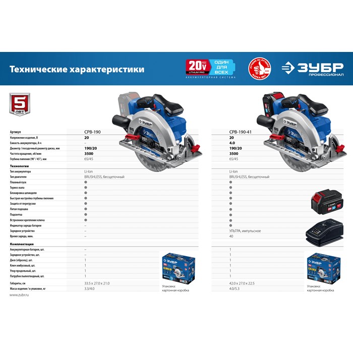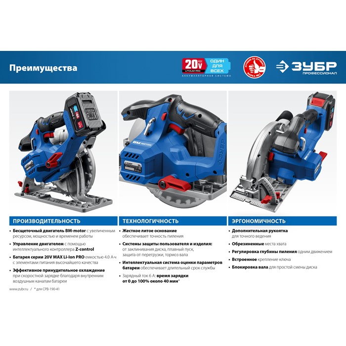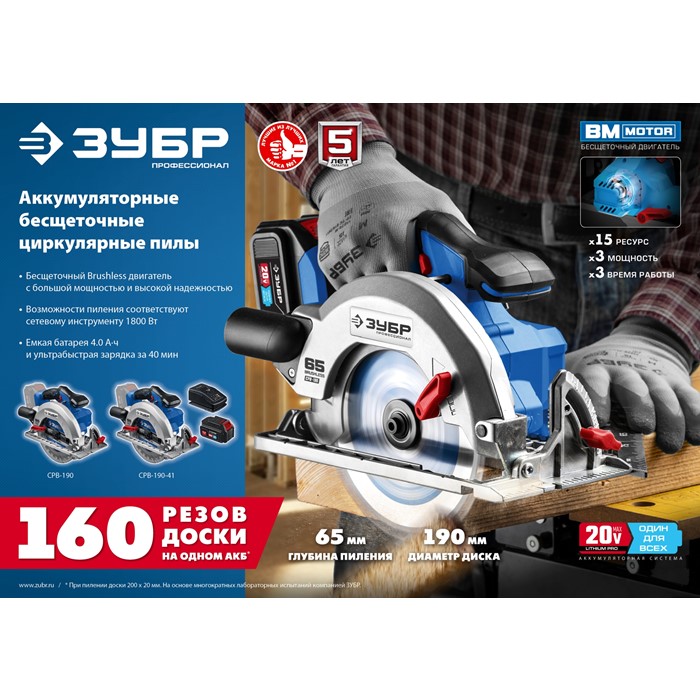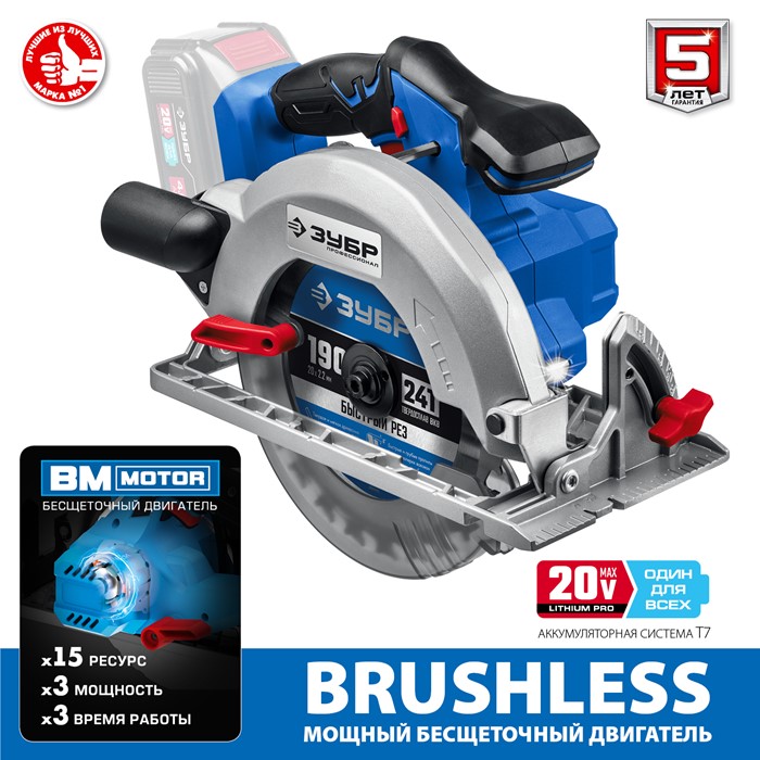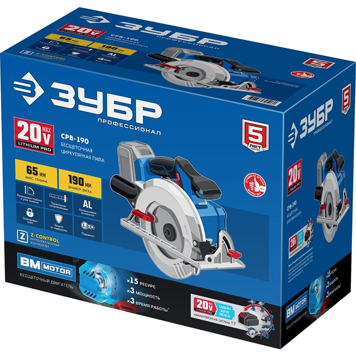 Бесщеточная пила циркулярная, без АКБ, в коробке CPB-190 Зубр