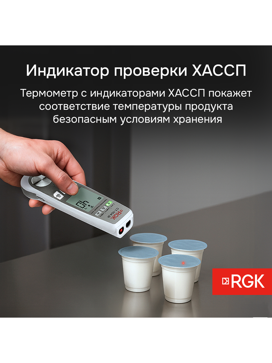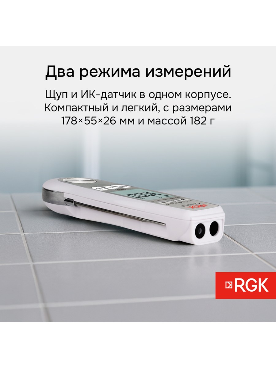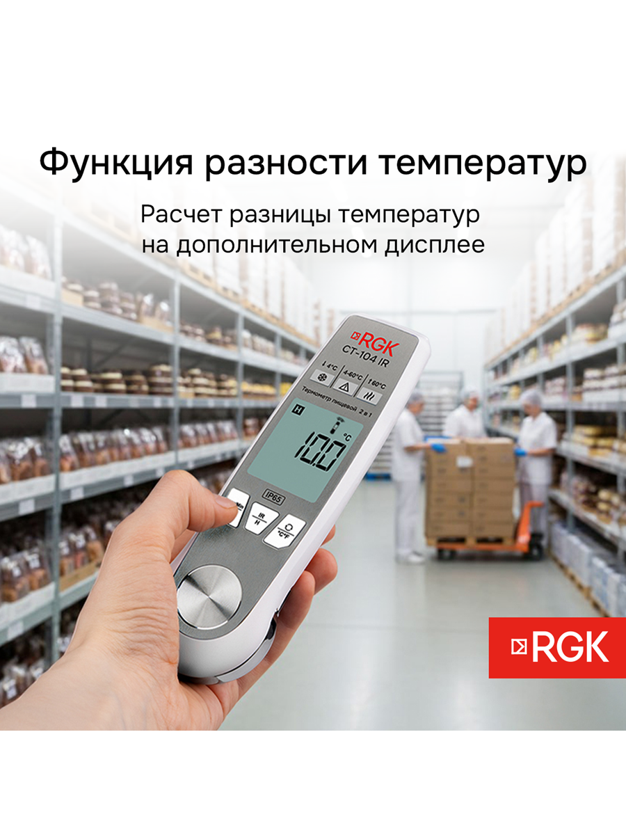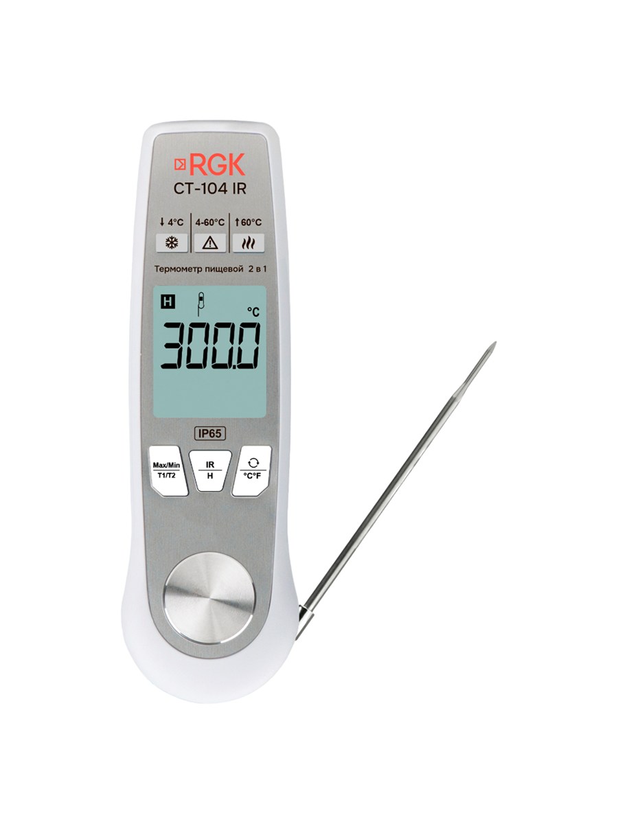 Пищевой термометр RGK CT-104 IR представляет собой комбинированный инструмент, обеспечивающий контроль поверхностной и внутренней температуры продуктов, сырья, полуфабрикатов, а также других целевых объектов, для чего оборудуется инфракрасной системой, реализующей функции пирометра, и погружным зондом. Обладая широким измерительным диапазоном, изделие подходит как для отслеживания условий хранения термолабильной продукции, в том числе замороженной, так и для оценки соблюдения технологии приготовления пищи с применением тепловой обработки. Комбинированный измеритель температуры внесен в Госреестр СИ и может задействоваться в качестве средства оперативного контроля при инспекционных проверках, в ходе экспертиз и для решения других задач, попадающих под государственное регулирование.