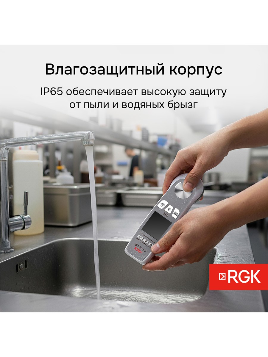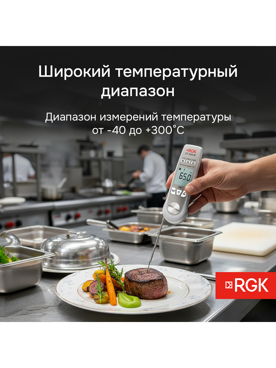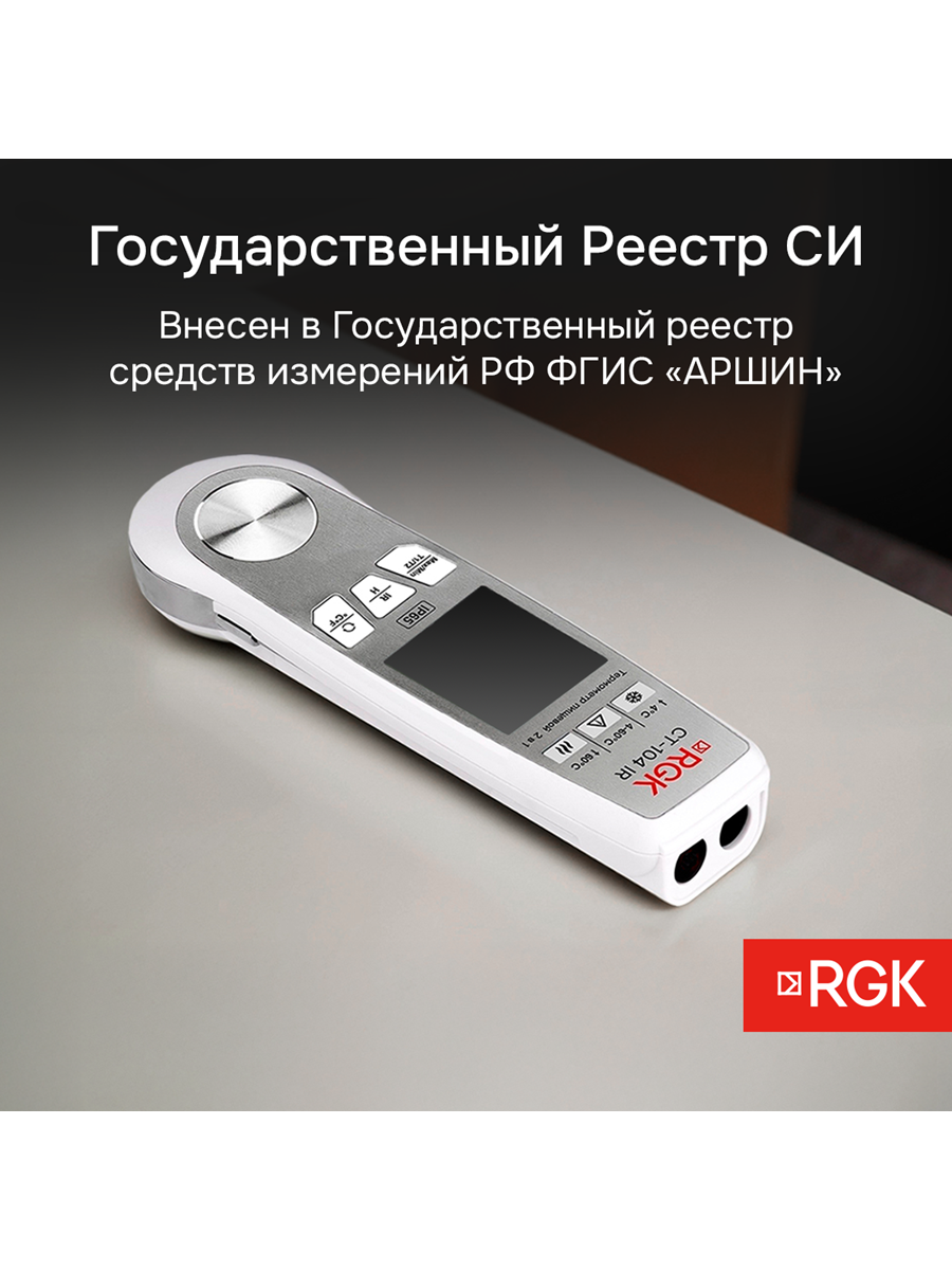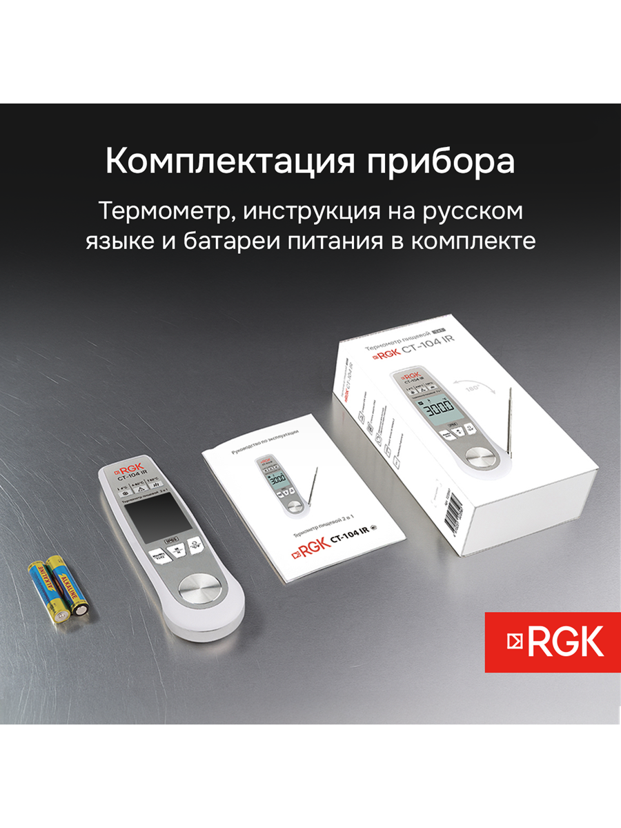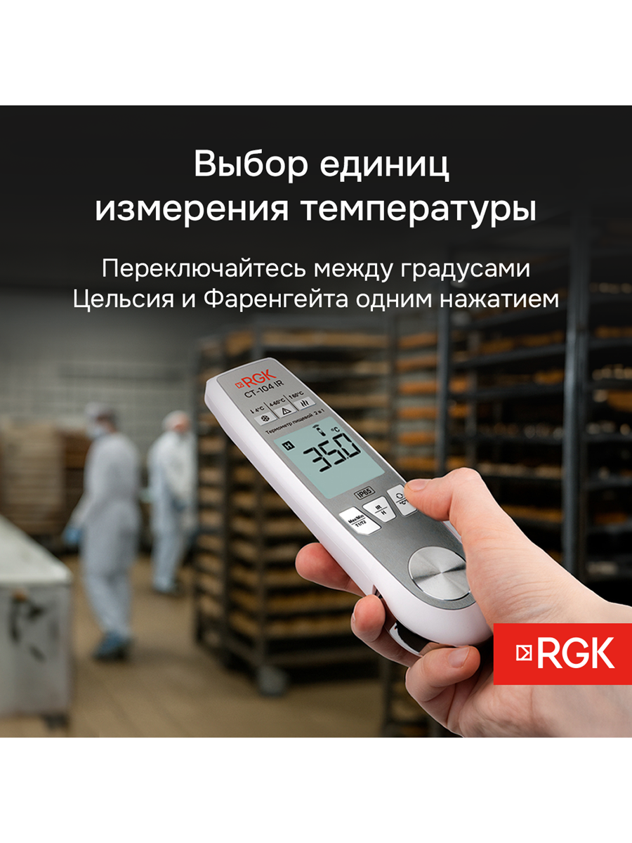 Пищевой термометр RGK CT-104 IR представляет собой комбинированный инструмент, обеспечивающий контроль поверхностной и внутренней температуры продуктов, сырья, полуфабрикатов, а также других целевых объектов, для чего оборудуется инфракрасной системой, реализующей функции пирометра, и погружным зондом. Обладая широким измерительным диапазоном, изделие подходит как для отслеживания условий хранения термолабильной продукции, в том числе замороженной, так и для оценки соблюдения технологии приготовления пищи с применением тепловой обработки. Комбинированный измеритель температуры внесен в Госреестр СИ и может задействоваться в качестве средства оперативного контроля при инспекционных проверках, в ходе экспертиз и для решения других задач, попадающих под государственное регулирование.