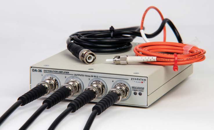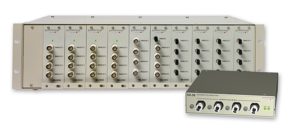 Распределение частоты через оптическое волокно или коаксиальный кабель, с минимальным джиттером и рассчитано на опорные сигналы 10 МГц (синус). Распределение полностью аналоговое, без использования ФАПЧ.