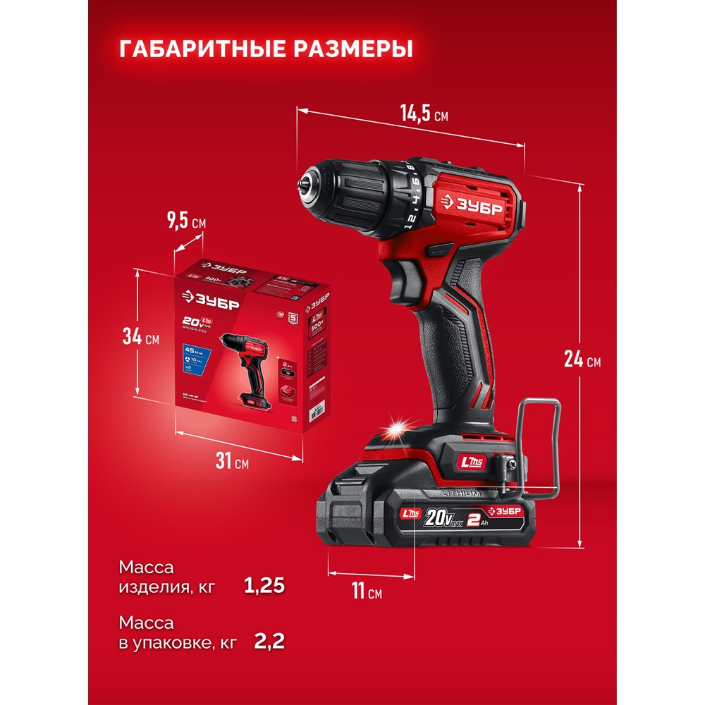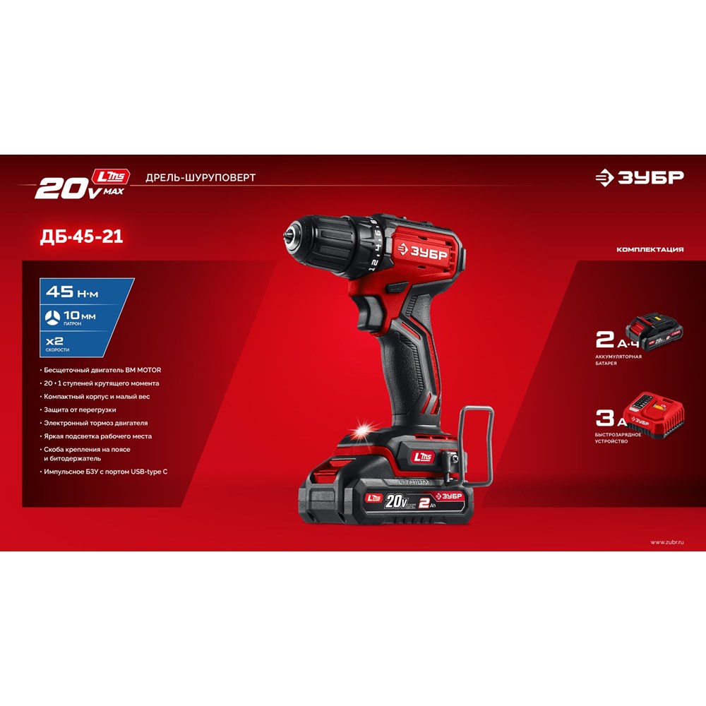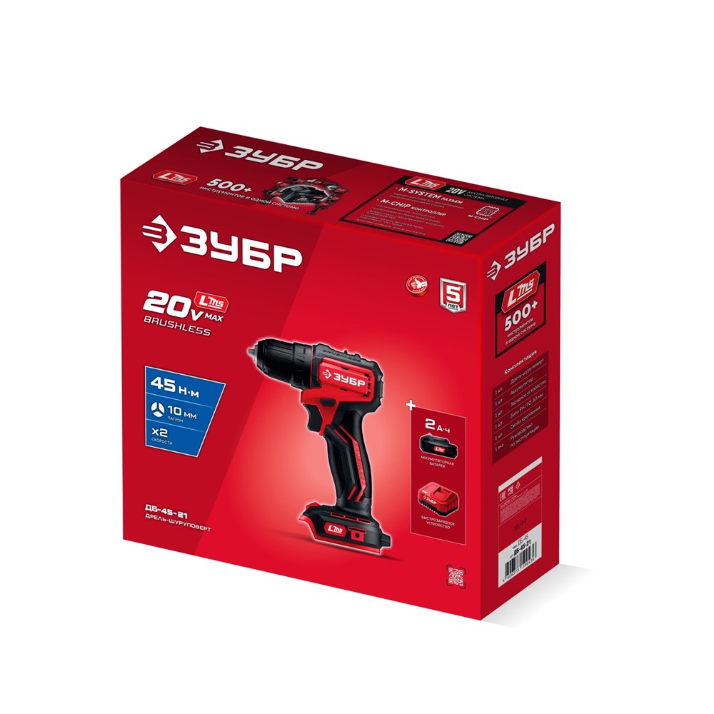 Бесщеточная дрель-шуруповерт (ДБ-45-21), 20 В, 45 Н·м, 1 АКБ LMS (2 А·ч)