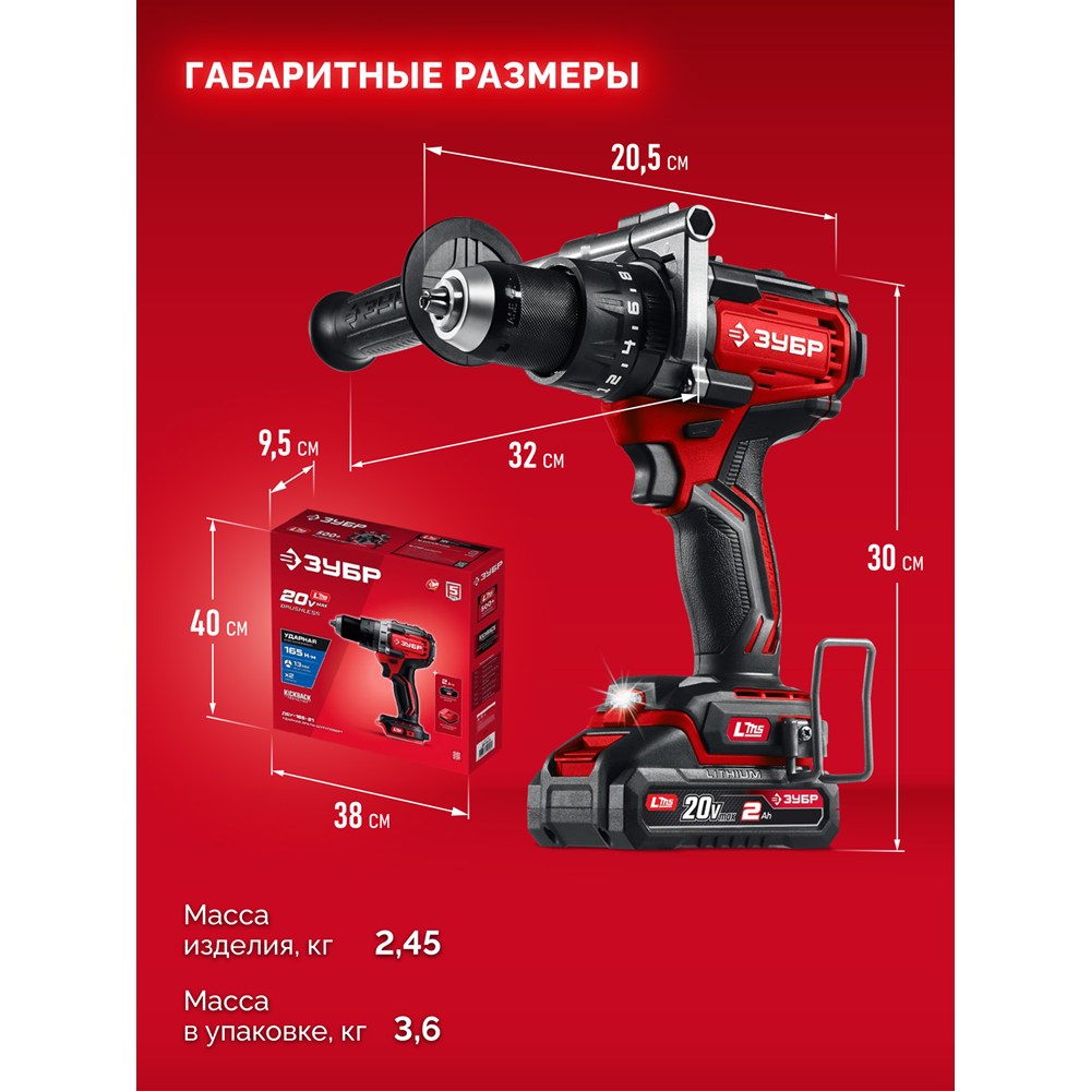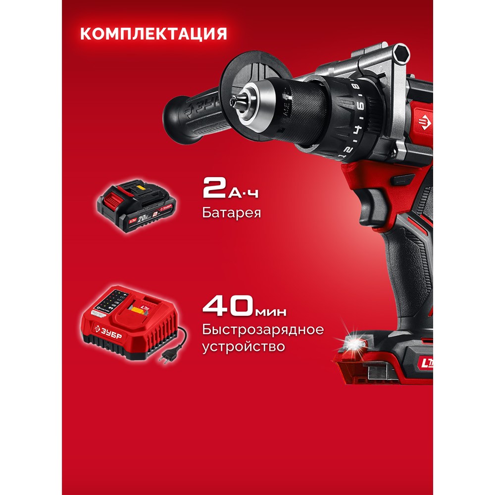 ЗУБР 20 В, 165 Н·м, 1 АКБ LMS (2 А·ч), бесщеточная ударная дрель-шуруповерт (ДБУ-165-21)