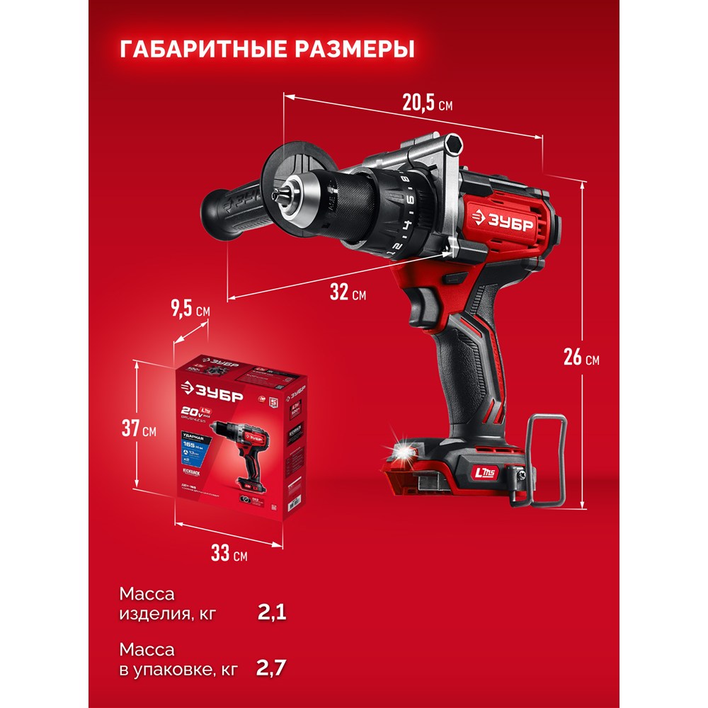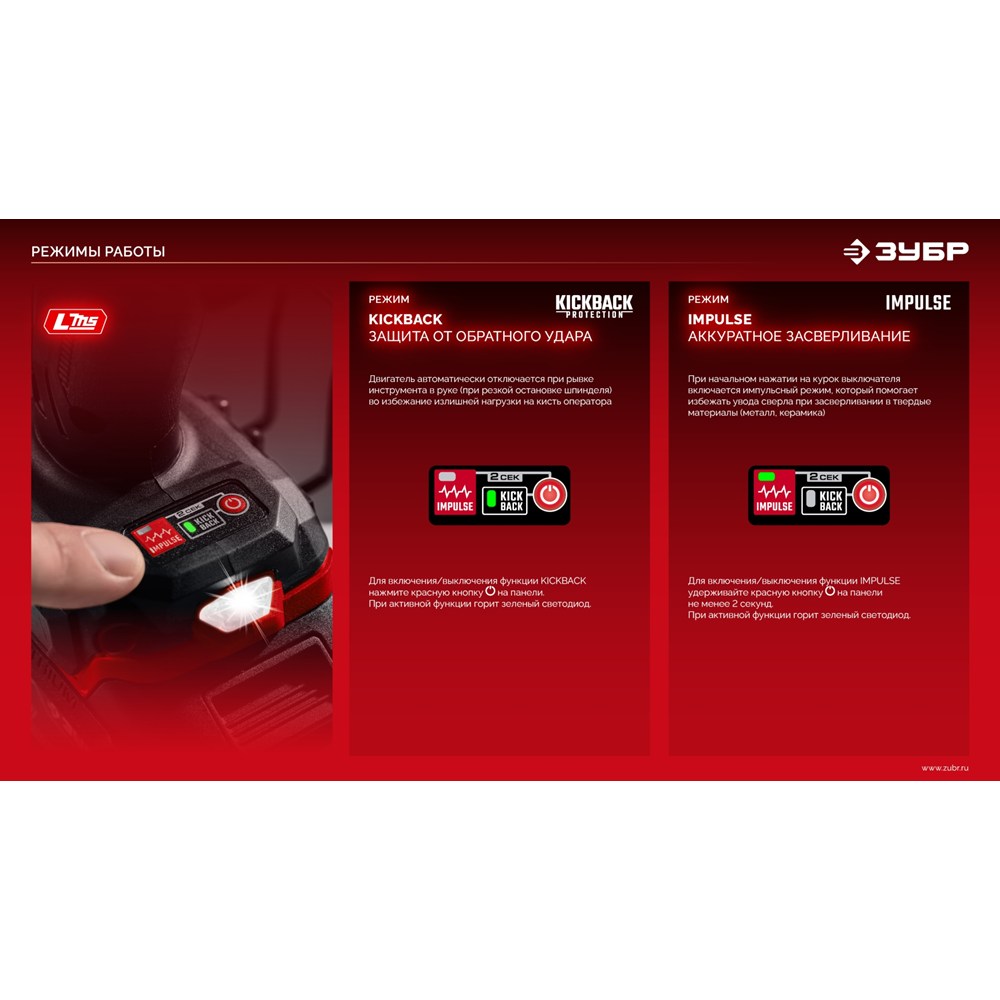 Бесщеточная ударная дрель-шуруповерт ЗУБР системы LMS с максимальным крутящим моментом 165 Нм предназначена для работы с самым крупным крепежом (саморезы до 12 мм диаметром) и сверления отверстий до 40 мм в дереве. Встроенная защита от обратного удара предотвращает повреждение кисти при резкой блокировке вала. Расширенная функциональность за счет ударного режима работы