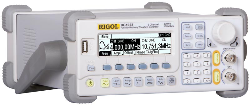 Универсальный генератор сигналов Rigol DG1022 может формировать сигналы стандартных форм, специальных форм, сигналы с АМ, ЧМ, ФМ, ЧМн модуляцией, пачки импульсов. Кроме того, генератор сигналов Rigol DG1022 позволяет выполнять качание частоты (свипирование) и генерировать формы сигналов, созданных пользователем.