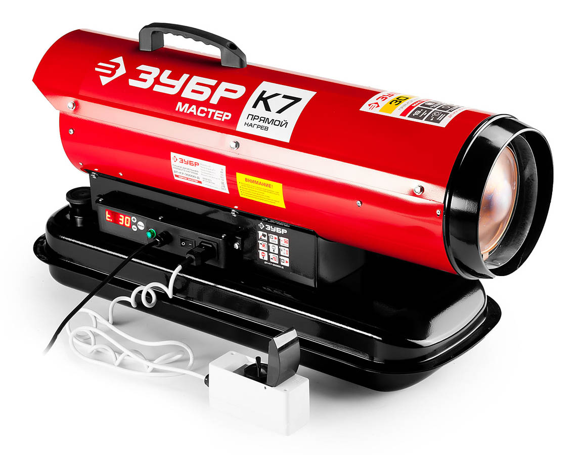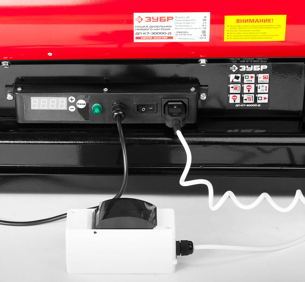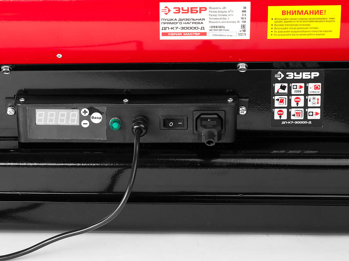 Пушка ЗУБР "МАСТЕР" дизельная тепловая, 220В, 30,0кВт, 400 м.куб/час, 18,5л, 2,5кг/ч, дисплей, подкл. внешнего термостата