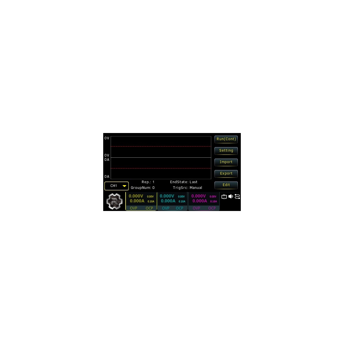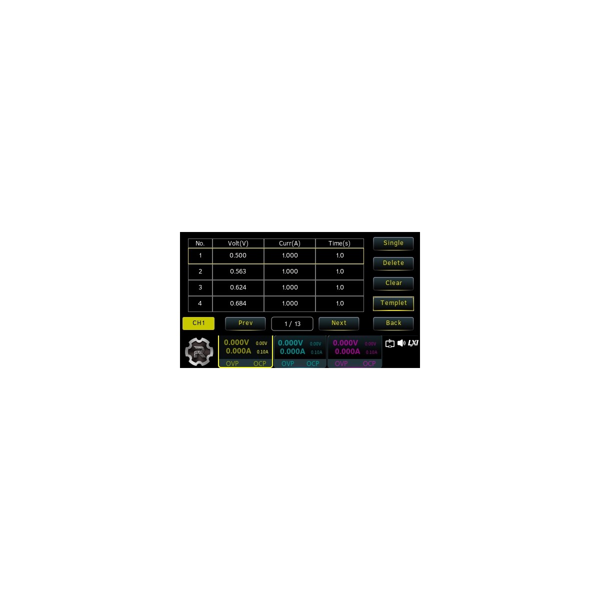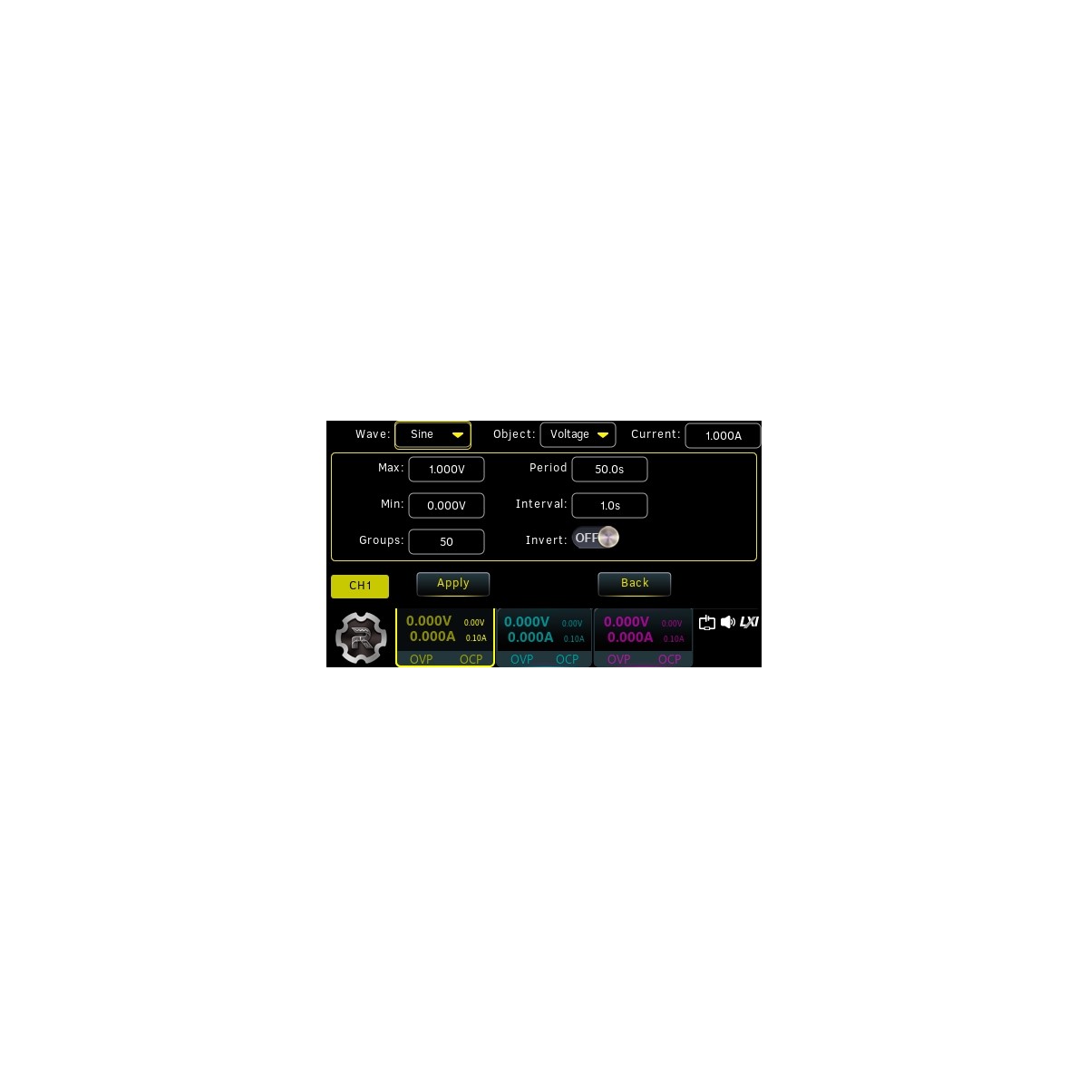 Программная опция DP900-ARB активирует функцию генератора сигналов произвольной формы (СПФ) – изменения выходных напряжения и тока на основе предварительно заданных табличных параметров этих величин. Отредактированные параметры генератора СПФ таймера могут быть сохранены во внутренней энергонезависимой памяти и при необходимости вызваны из неё. Имеются встроенные шаблоны следующих форм - синуса, импульсов, пилы, нарастающего ступенчатого напряжения, спадающего ступенчатого напряжения, нарастающей экспоненты, спадающей экспоненты. Шаблоны могут быть отредактированы пользователем. Минимальный шаг изменения выходных величин напряжения/тока - 100 мс. На выходе могут быть установлены режимы – CC (constant current), CV (constant voltage) и UR (unregulated).