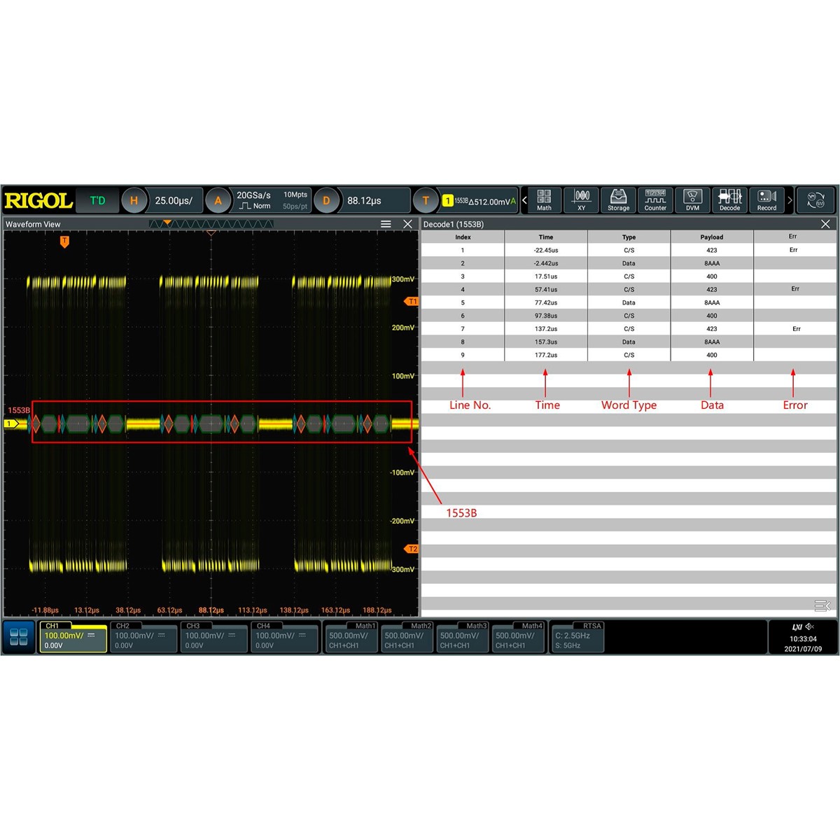 Программная опция DS80000-AEROA активирует в осциллографах RIGOL серии DS80000 возможность запуска, декодирования и анализа сигналов последовательной шины передачи данных MIL-STD-1553.
