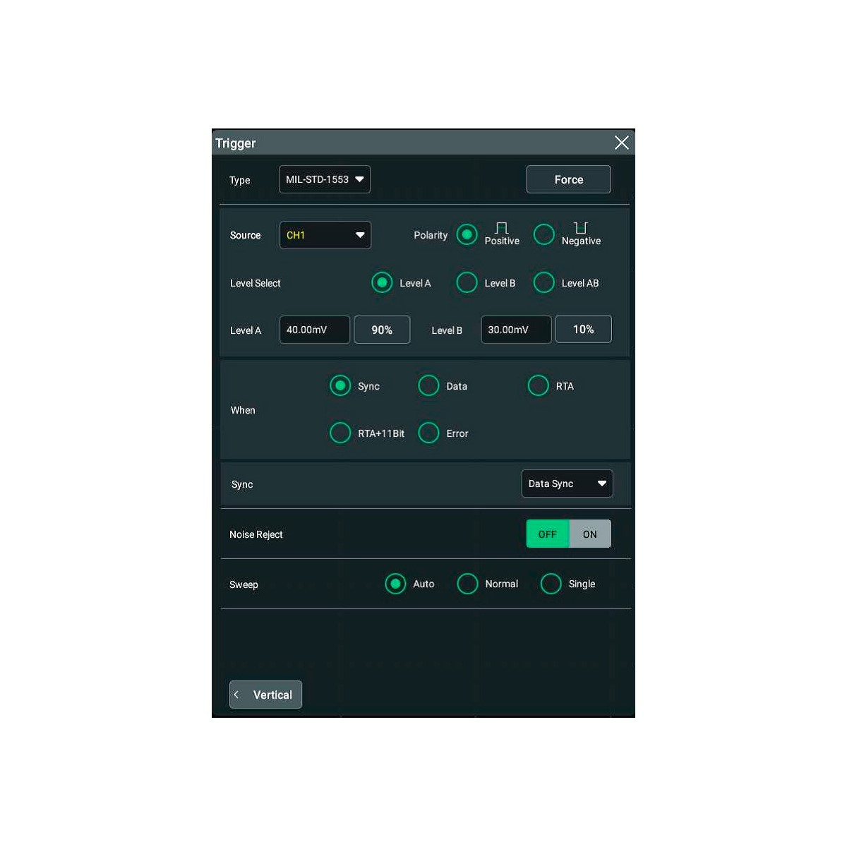 Запуск сигналов шины MIL-STD-1553 можно осуществлять по синхросигналу командного слова (Cmd Sync), по синхросигналу слова передачи данных (Data Sync), по синхросигналу статусного слова /слова состояния (Status Sync) по всем синхросигналам, по слову данных (Data), по адресу удалённого терминала (RTA), по адресу удалённого терминала + 11 бит (RTA+11 бит), по ошибкам Sync (если найден недопустимый импульс Sync Error), по ошибкам контроля чётности (Check Error).