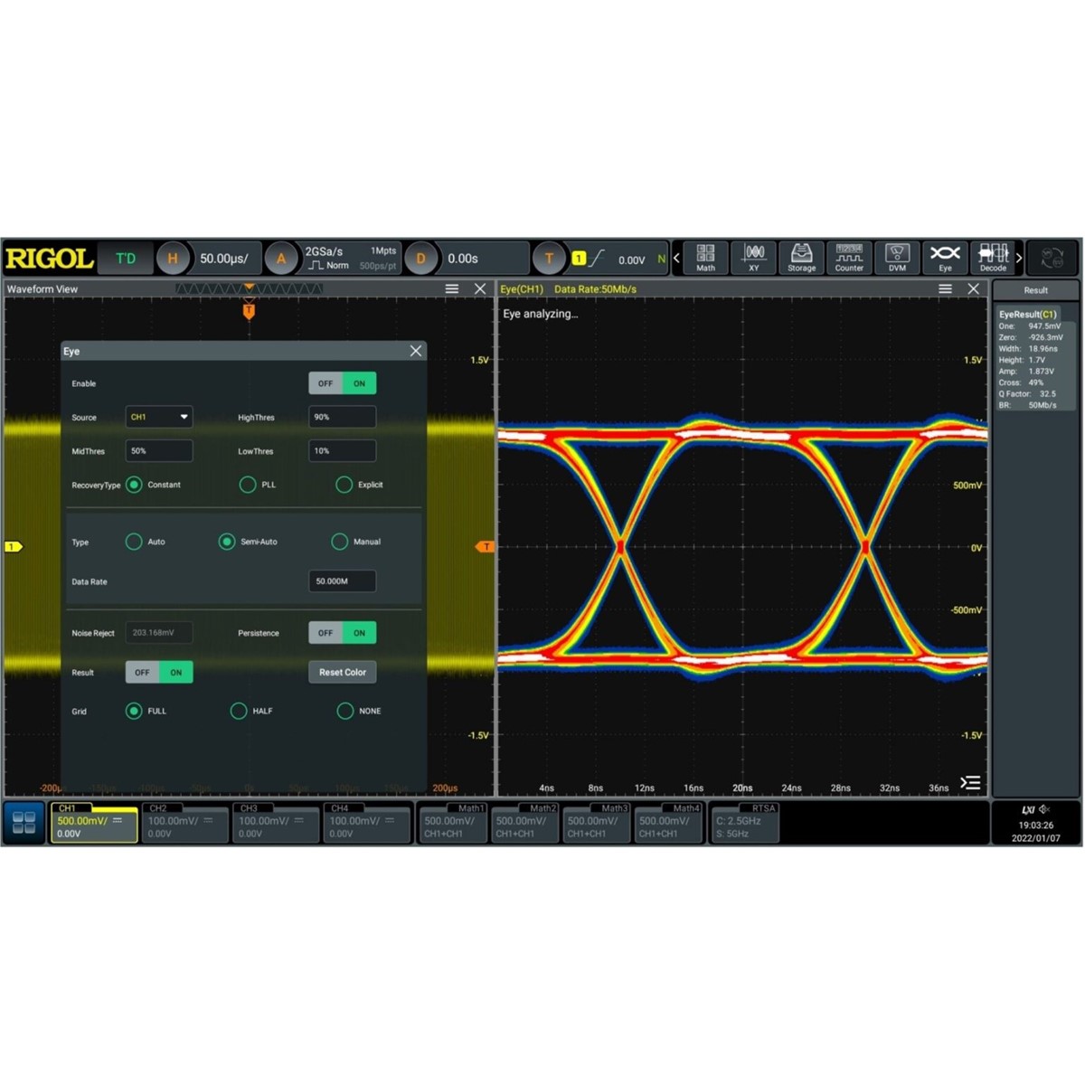 Параметры измерения джиттера и глазковой карты Rigol DS80000-JITTA