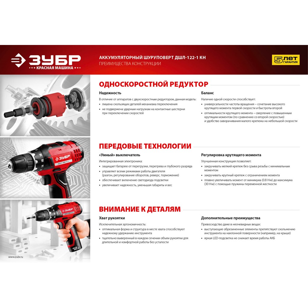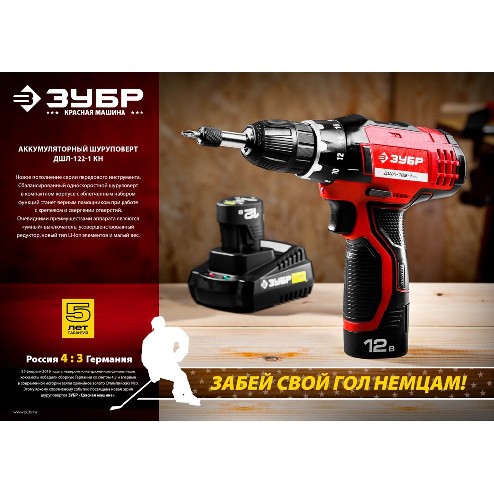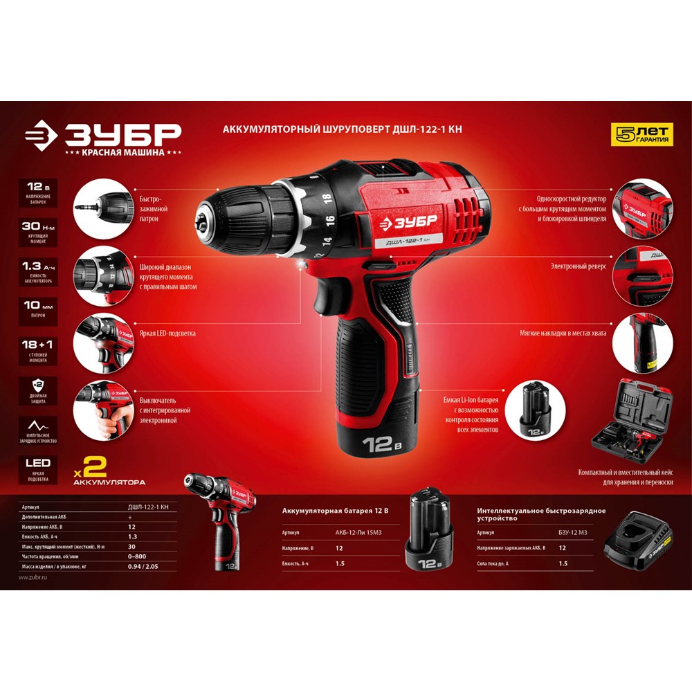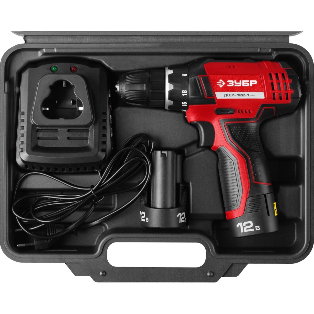 Аккумуляторная дрель-шуруповерт ЗУБР ДШЛ-122-1 КН, предназначена для сверления отверстий в различных материалах (при установке соответствующих сверл), закручивания/откручивания резьбовых соединений (при установке соответствующих бит),перемешивания ЛКМ (при установке соответствующих насадок). Эргономичный и производительный инструмент - Ваш надежный помощник в сверлении отверстий в различных материалах и вкручивании/выкручивании крепежа. Легкая, с оптимальной развесовкой и удобным хватом при больших мощности и крутящем моменте - шуруповерт ЗУБР способен справиться даже с самой серьезной работой