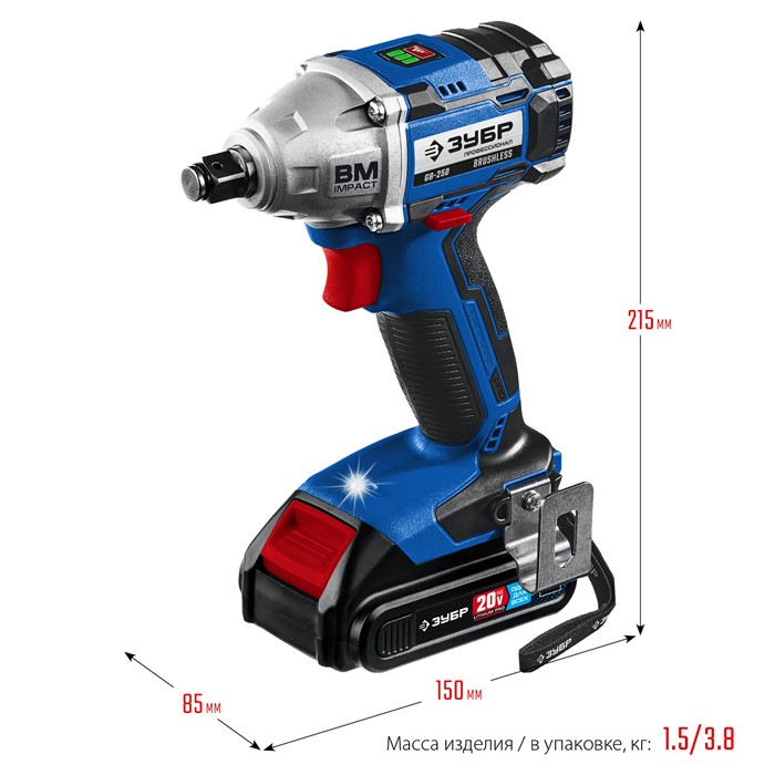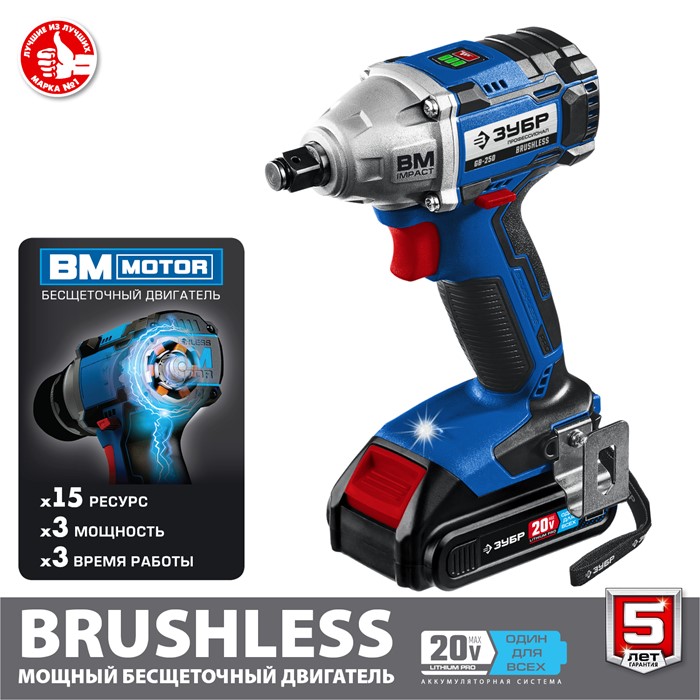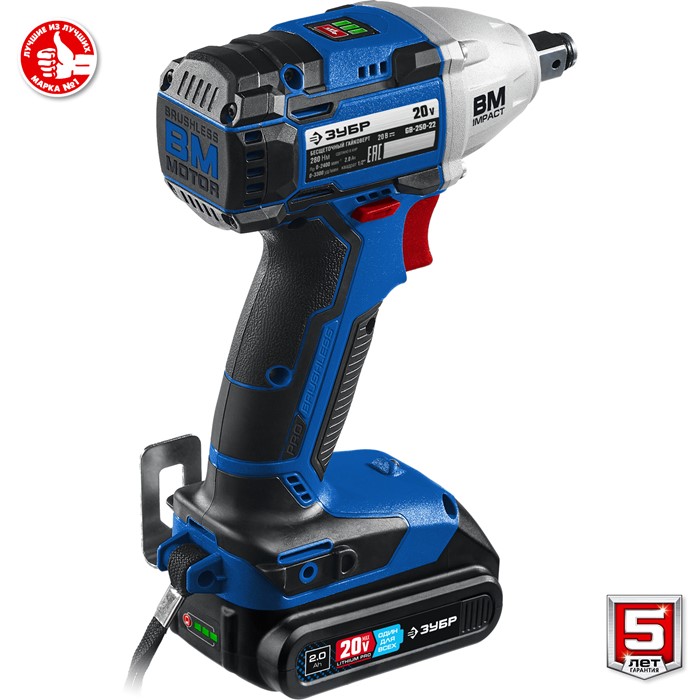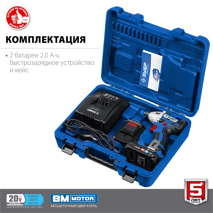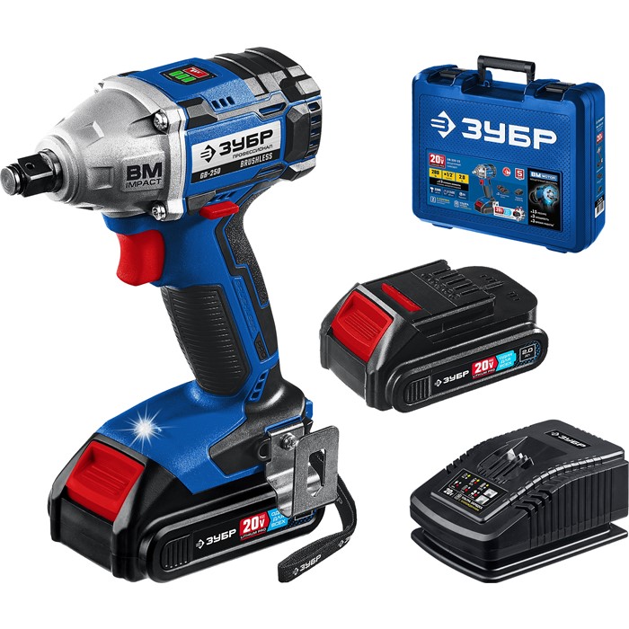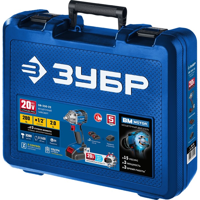 Удврный бесщеточный гайковерт, 2 АКБ (2 Ач), в кейсе GB-250-22 Зубр