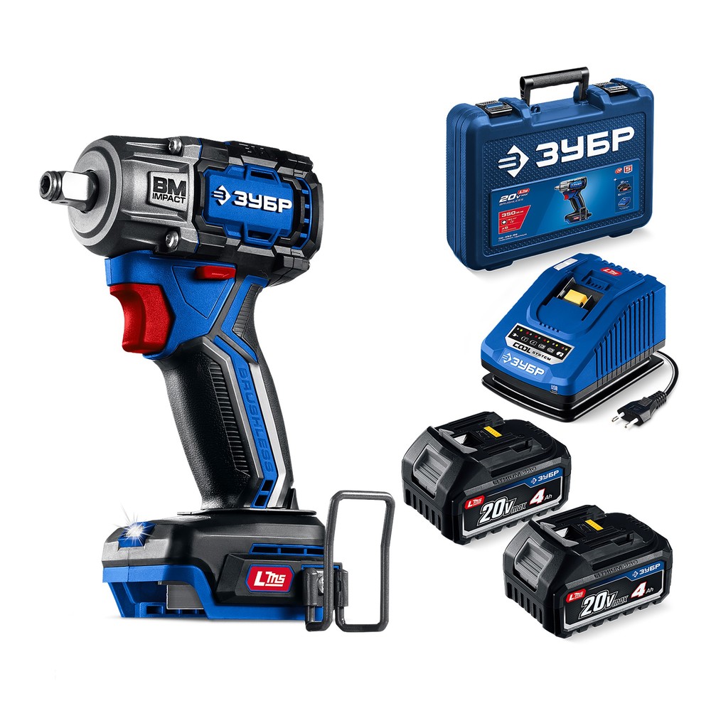 ЗУБР 20 В, 350 Н·м, 2 АКБ LMS (4 А·ч), бесщеточный ударный гайковерт, кейс, ПРОФЕССИОНАЛ (GB-350-42)