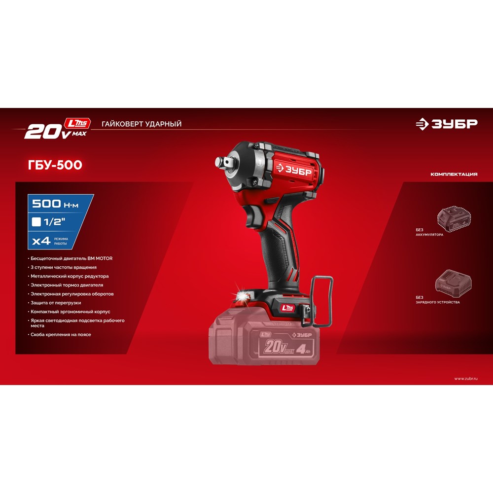 Бесщеточный ударный гайковерт (ГБУ-500), 20 В, 500 Н·м, без АКБ (LMS)