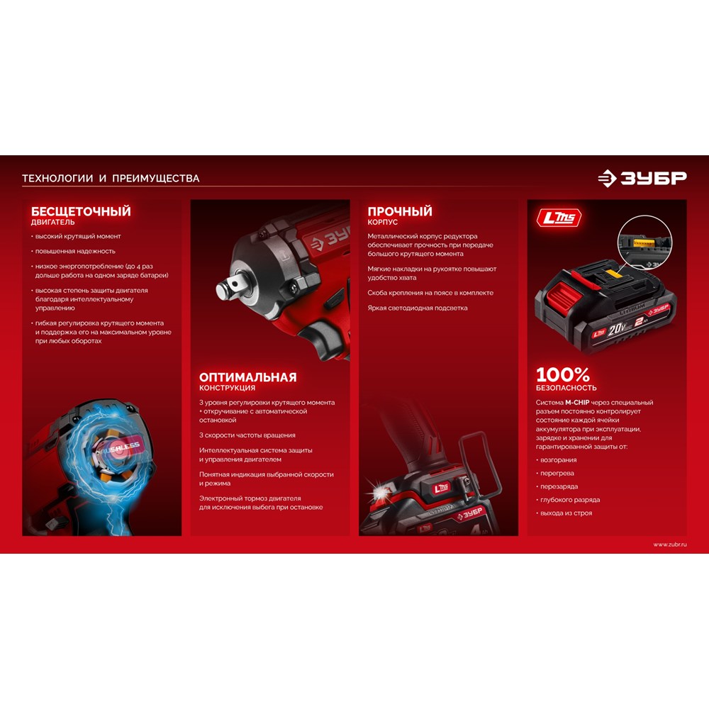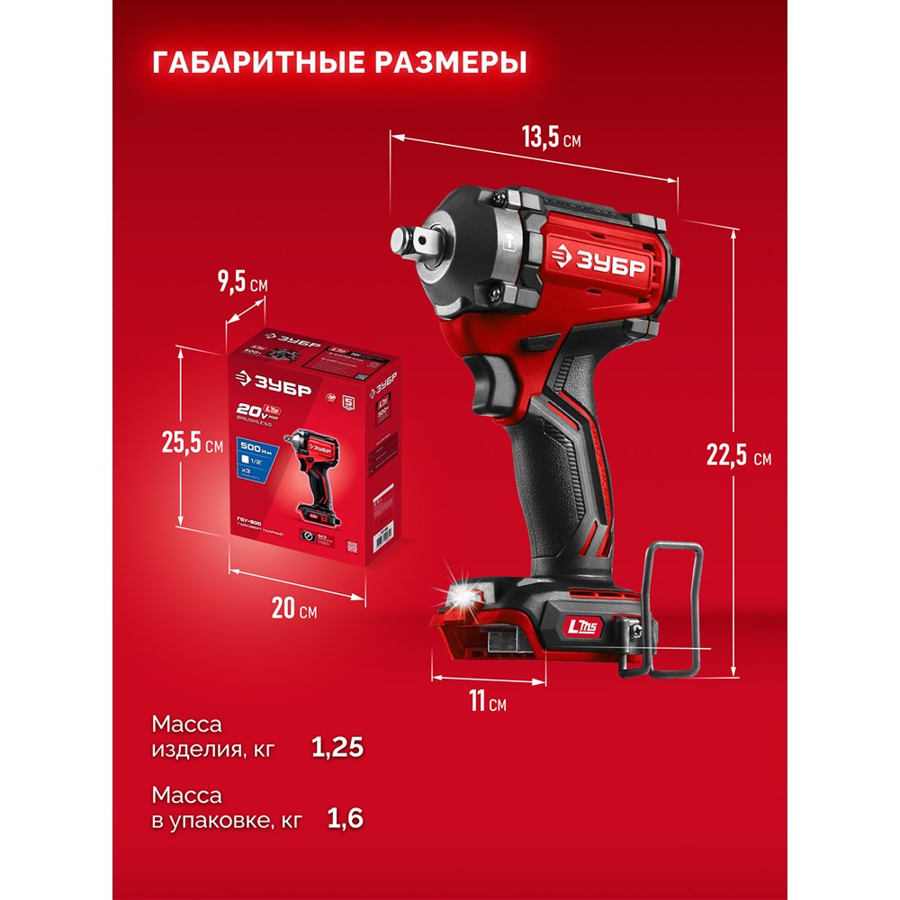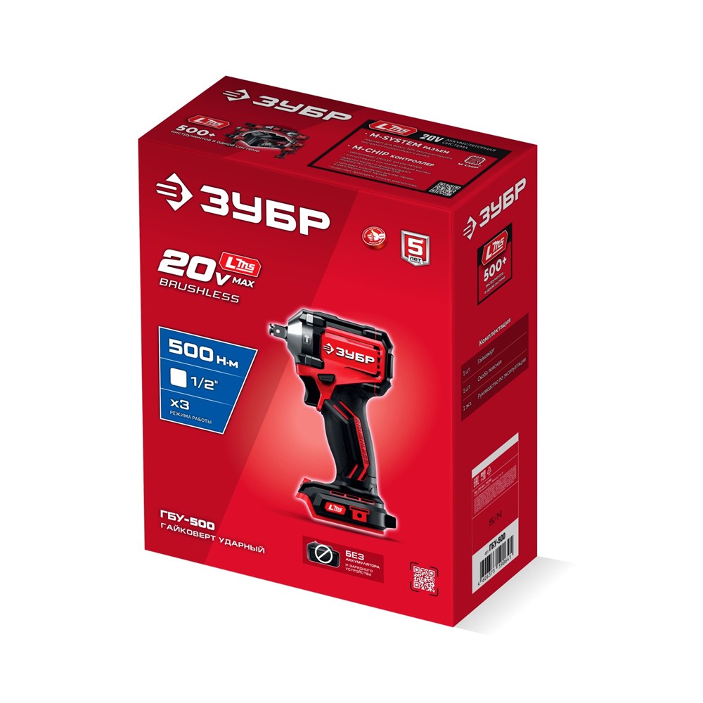 Бесщеточный ударный гайковерт ЗУБР системы LMS с максимальным крутящим моментом 500 Нм предназначен для фиксации резьбовых соединений размером до М22. Ударная функция с тангенциальным направлением удара обеспечивает эффективное заворачивание без реактивного момента на кисть оператора