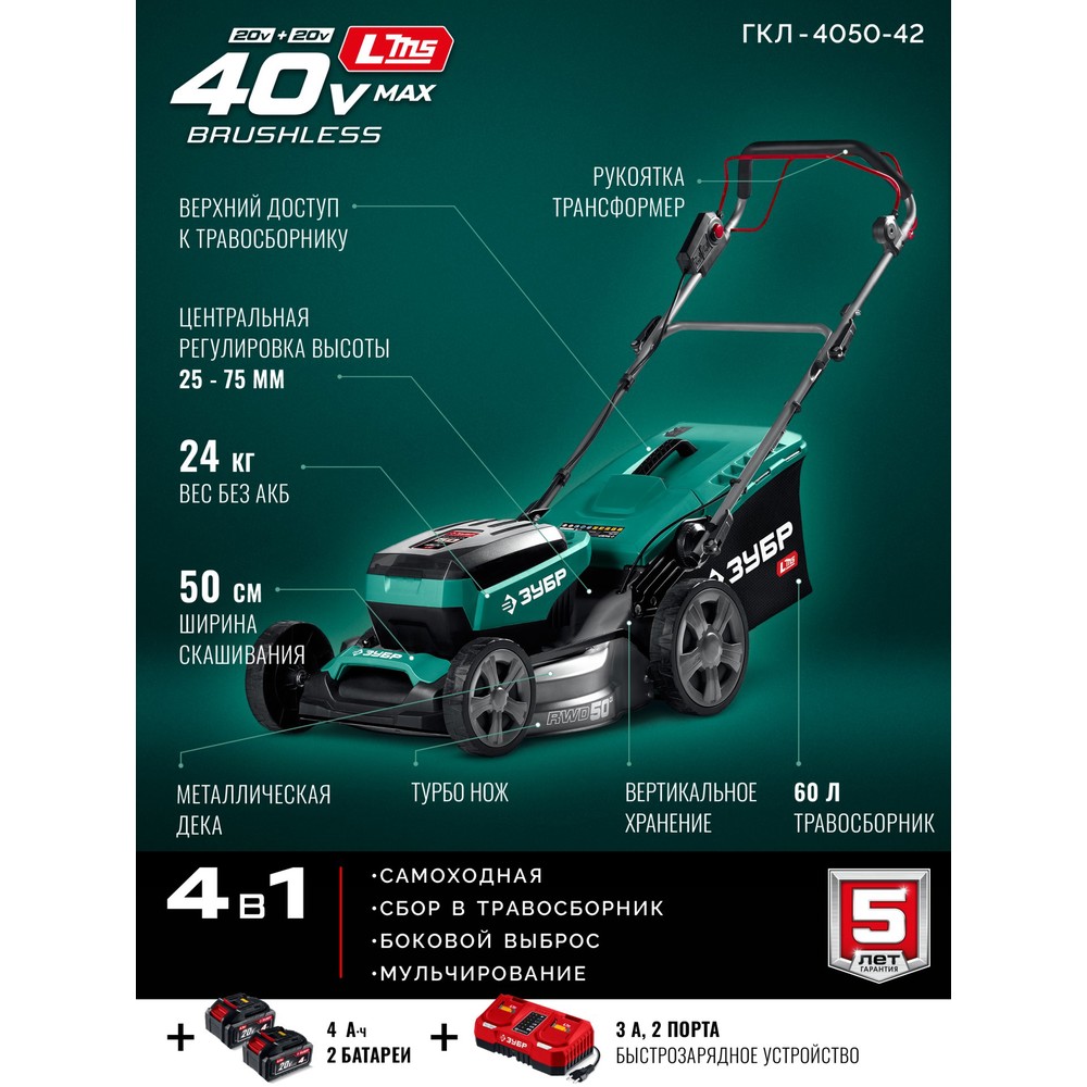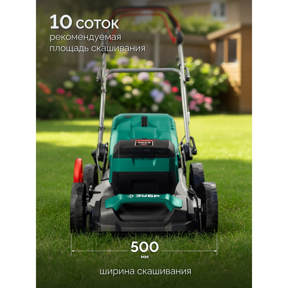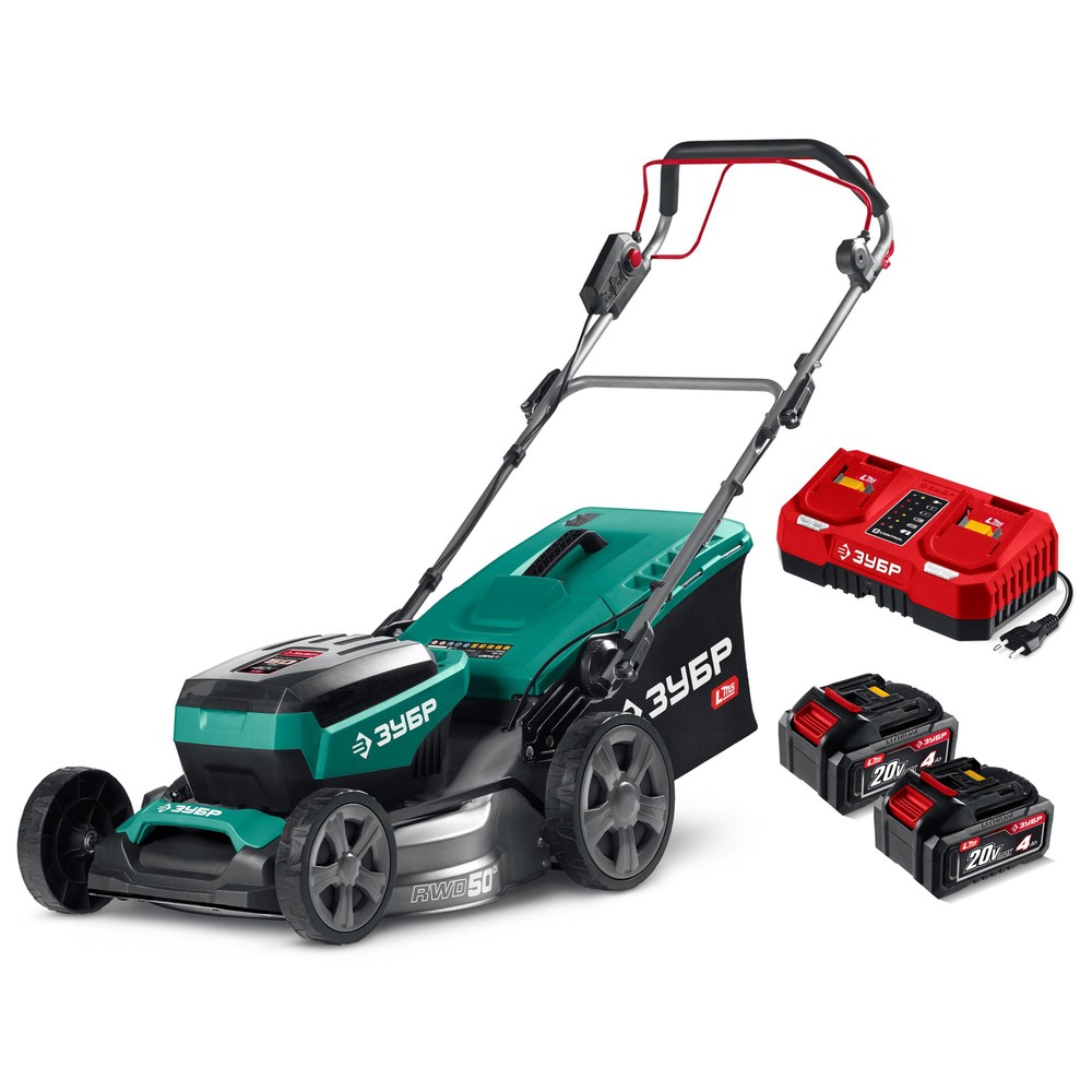 ЗУБР 40 В (2x20В), 500 мм, 2 АКБ LMS (4 Ач), самоходная газонокосилка аккумуляторная бесщеточная (ГКЛ-4050-42)