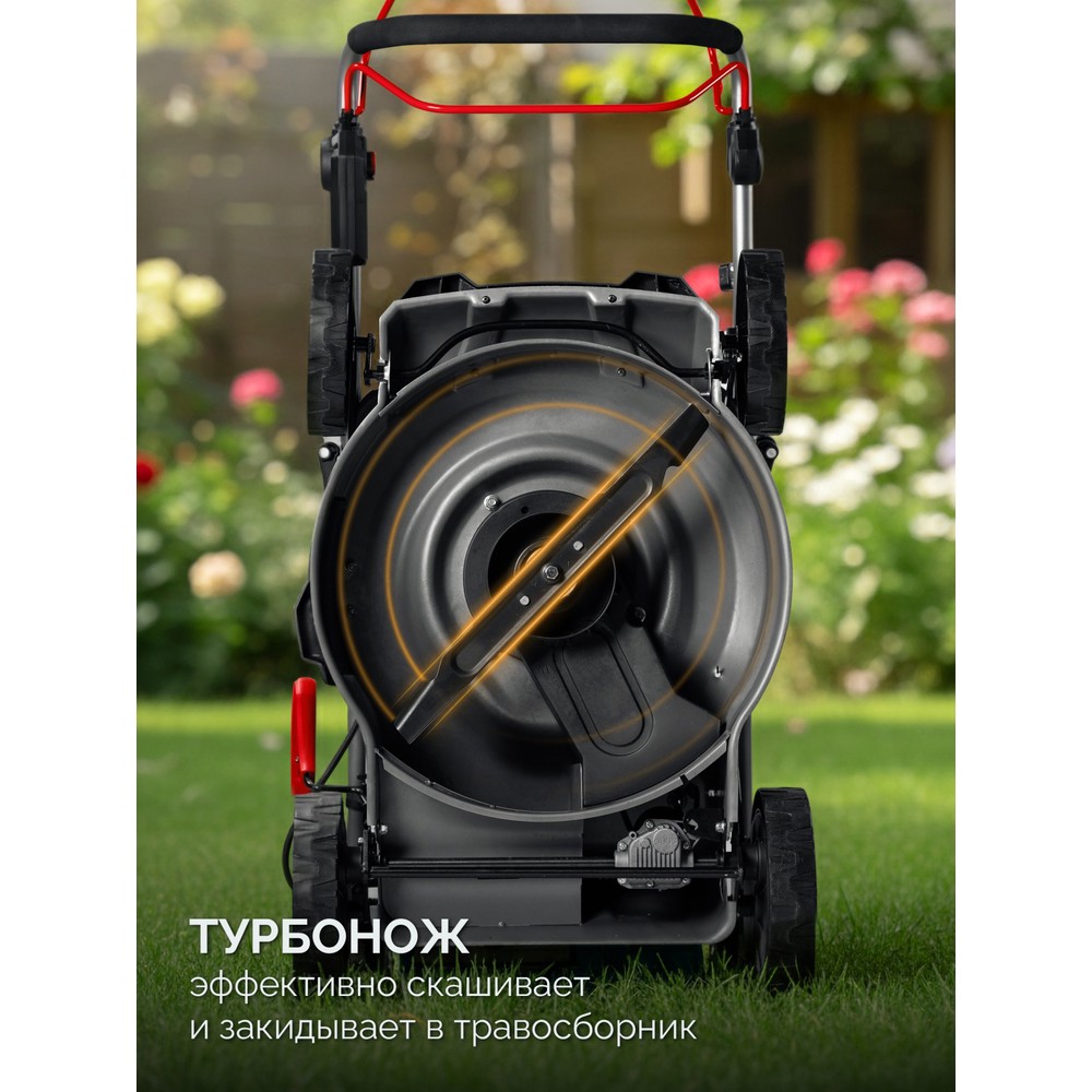 - Самоходное движение с приводом на задние колеса облегчает перемещение газонокосилки
