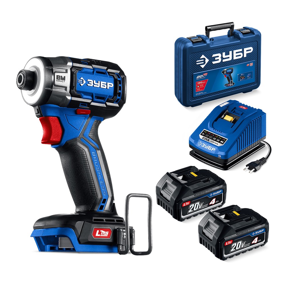 ЗУБР 20 В, 190 Н·м, 2 АКБ LMS (4 А·ч), бесщеточный ударный винтоверт, кейс, ПРОФЕССИОНАЛ (GVB-190-42)