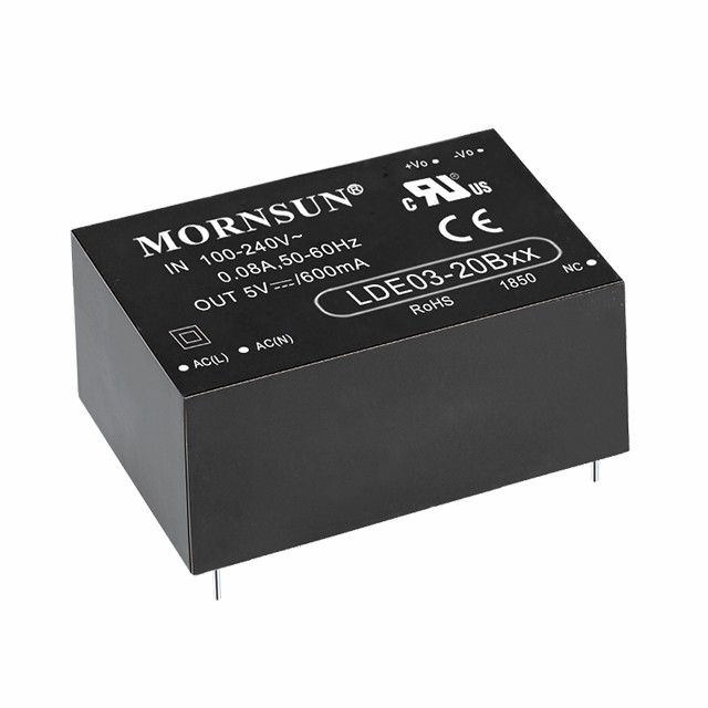 LDE03-20Bxx series is one of Mornsun’s compact size power converter. It features universal AC input and at the same time accepts DC input voltage, low power consumption, high efficiency, high reliability and double or reinforced insulation. It offers excellent EMC performance and for extremely harsh EMC environment, we recommend using the application circuit show in Design Reference of this datasheet. The converters meet CISPR32/EN55032, UL62368, EN62368, IEC62368 standards and are widely used in industrial, medical, electricity, instrumentation, telecommunications applications.