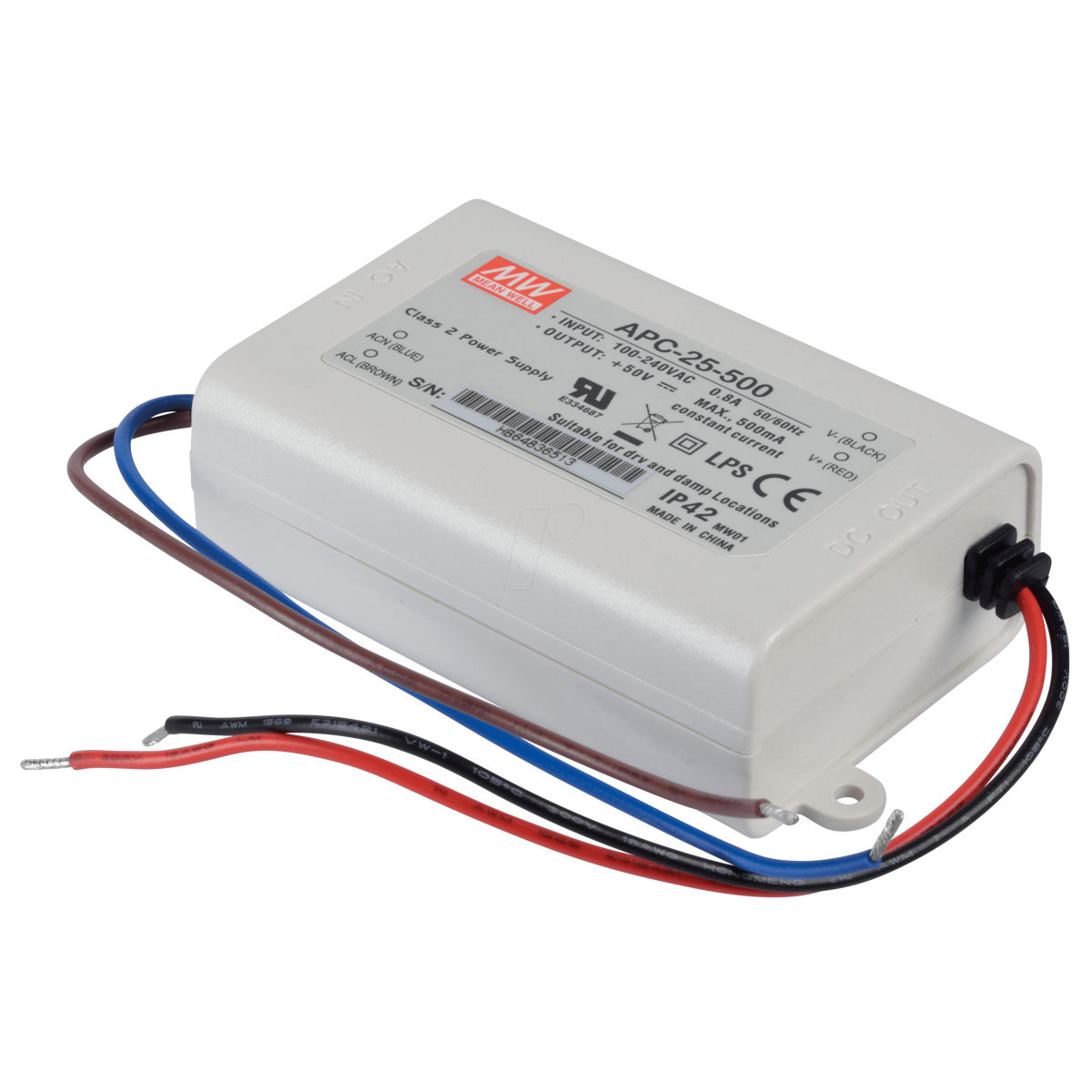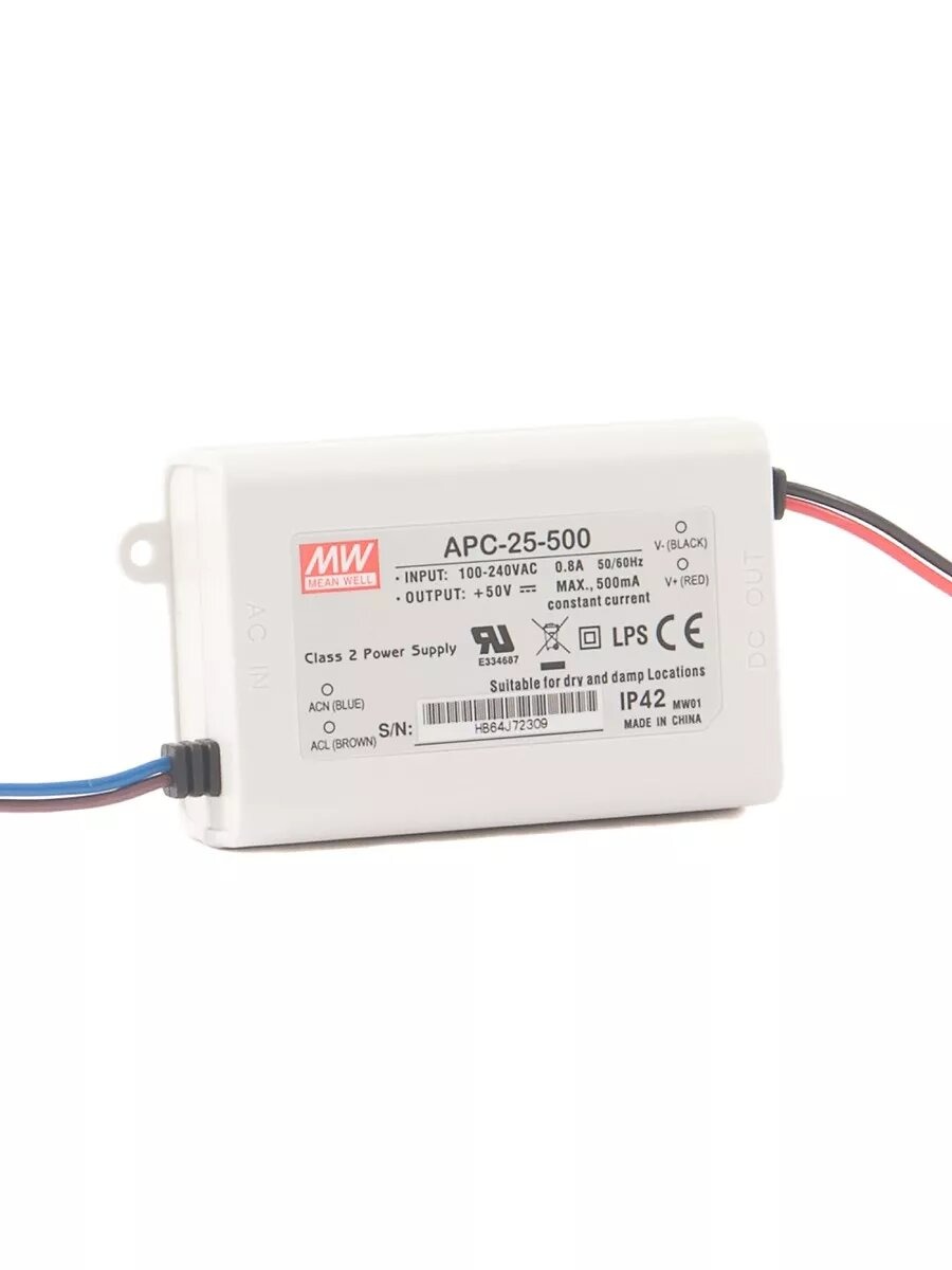 AC-DC, 25Вт, токовый выход, вход 90…264В AC, выход 500мА/15…50В, изоляция 3750В AC, в кожухе 84х57х29.5мм, -30…+70°С