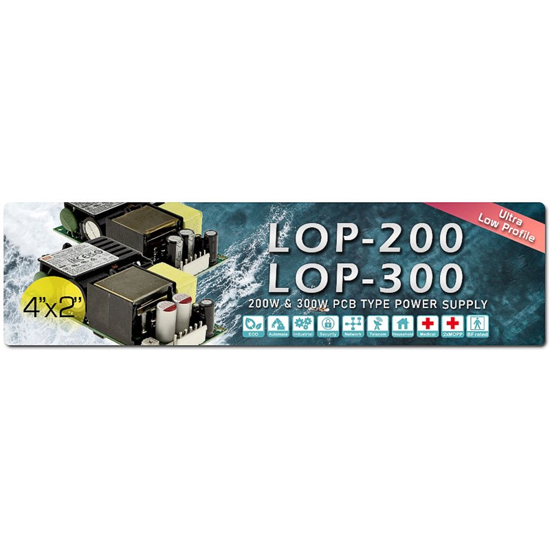 LOP-300 — это высоконадежный, энергоэффективный, низкопрофильный источник питания открытого типа мощностью 300 Вт с высокой плотностью мощности 37,5 Вт/дюйм³ в пределах стандартного размера 4" x 2", он имеет универсальный диапазон входного напряжения 80~264 В.