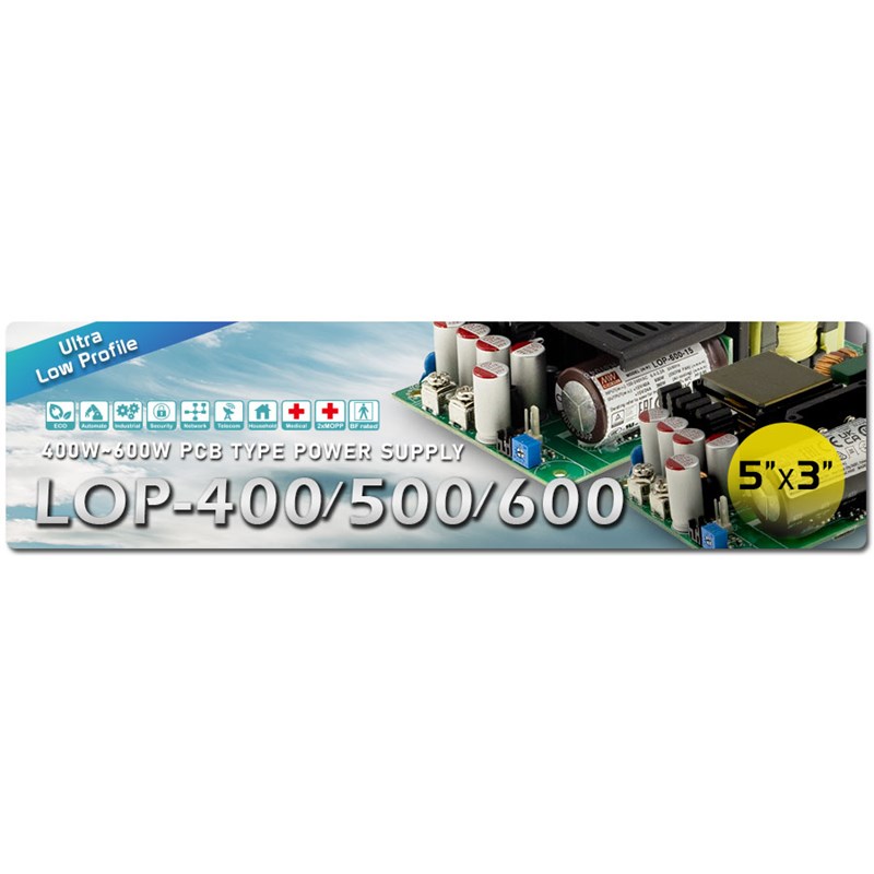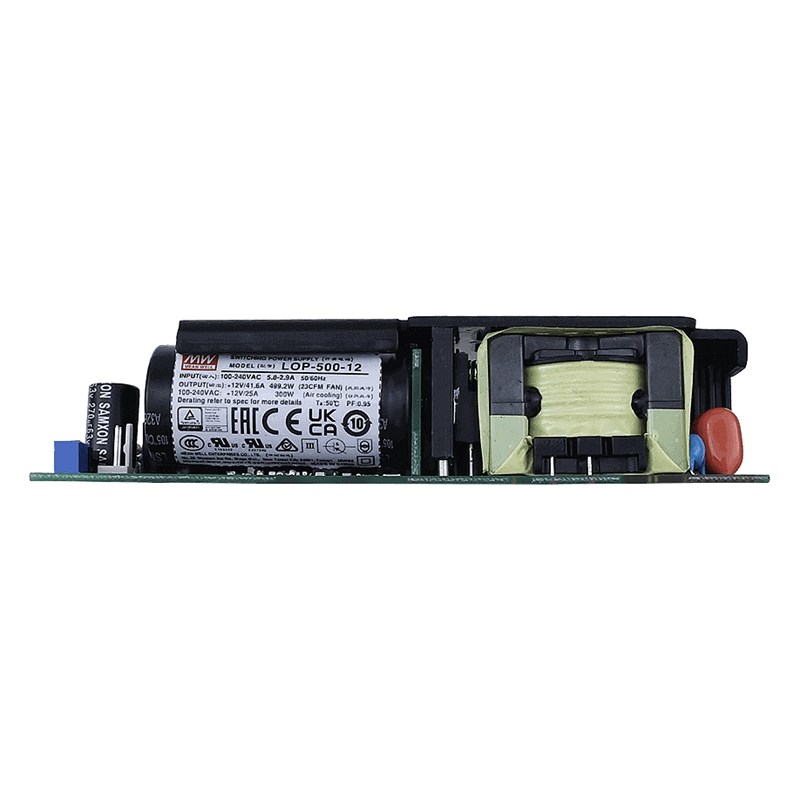 LOP-500 — это высоконадежный, энергоэффективный, низкопрофильный источник питания открытого типа мощностью 500 Вт с высокой плотностью мощности 27,8 Вт/дюйм³ в пределах стандартного размера 5" x 3", он имеет универсальный диапазон входного напряжения 80~264 В.