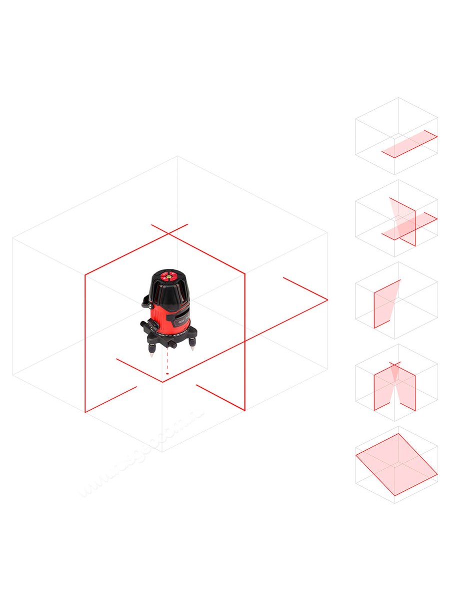 При включении прибора проецируется одна яркая горизонтальная плоскость с углом развертки 110°. Используя функциональные клавиши на верхней панели лазерного уровня RGK LP-62 вы можете активировать одну или две вертикальных плоскости – 120°. Крест, образующийся при пересечении двух вертикальных линий можно использовать в качестве зенита. В сочетании с точкой надира, которая проецируется лазерным отвесом это обеспечивает возможность переноса точек разметки с пола на потолок.