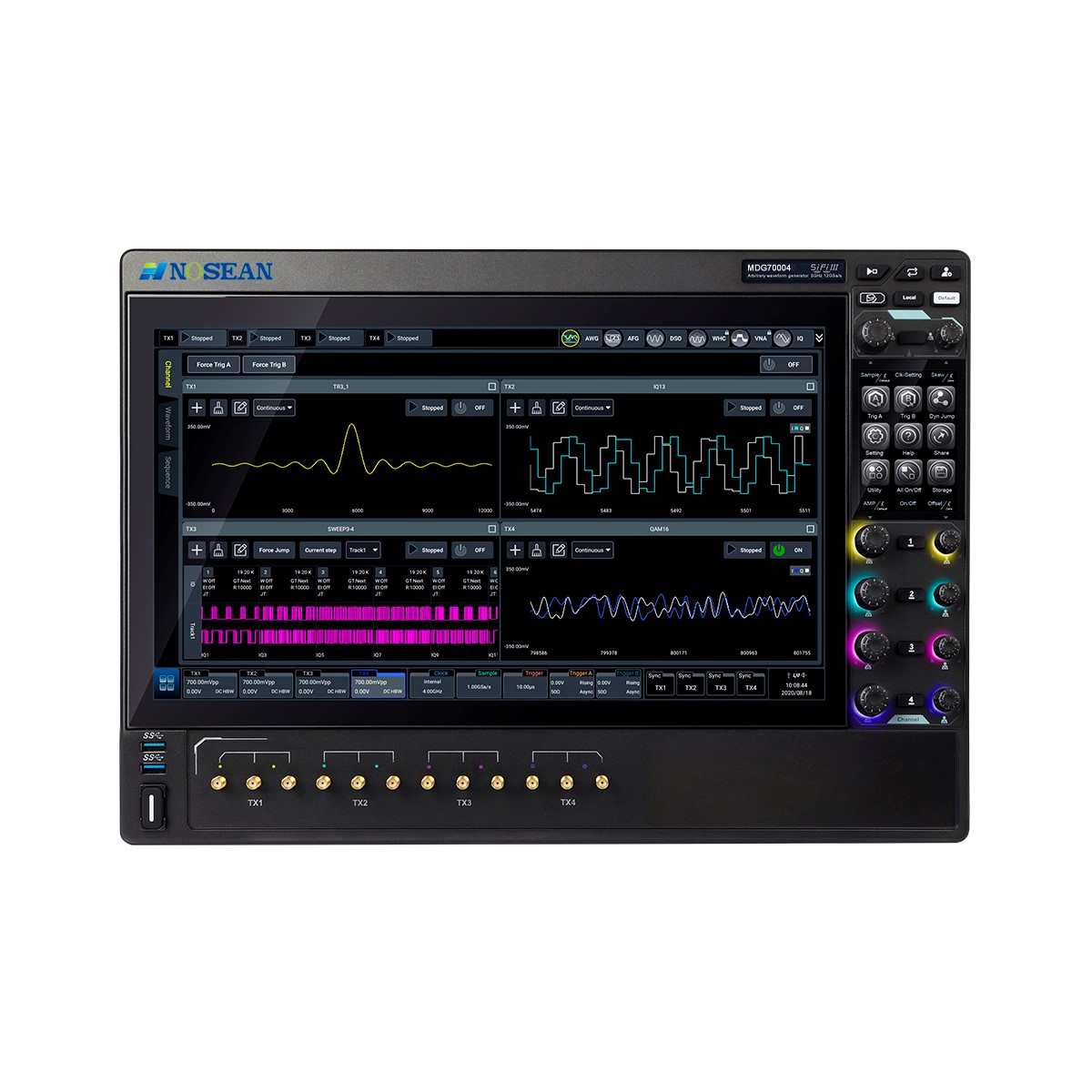 Nosean MDG70004 – это высокопроизводительный генератор сигналов произвольной формы с максимальной частотой дискретизации до 12 Гвыб/с, аналоговой полосой пропускания до 5 ГГц, разрешением по вертикали 16 бит и длиной сигнала произвольной формы до 1,5 Гточек и большим динамическим диапазоном.