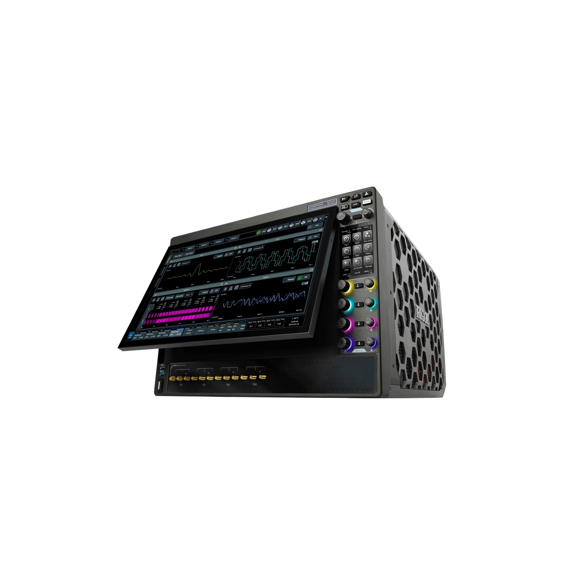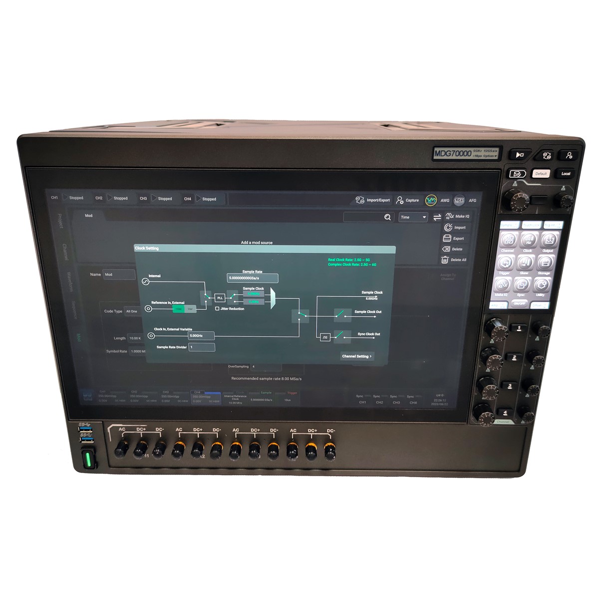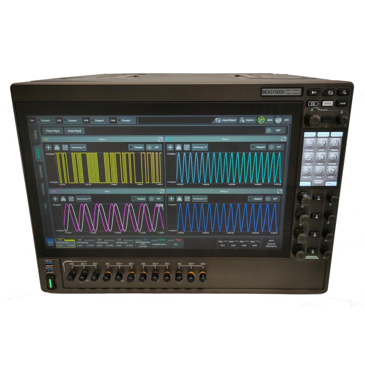 Генератор сигналов Nosean серии MDG70000 выполнен в моноблочном корпусе настольного исполнения и имеет 15,6-дюймовый сенсорный экран с изменяемым углом наклона.