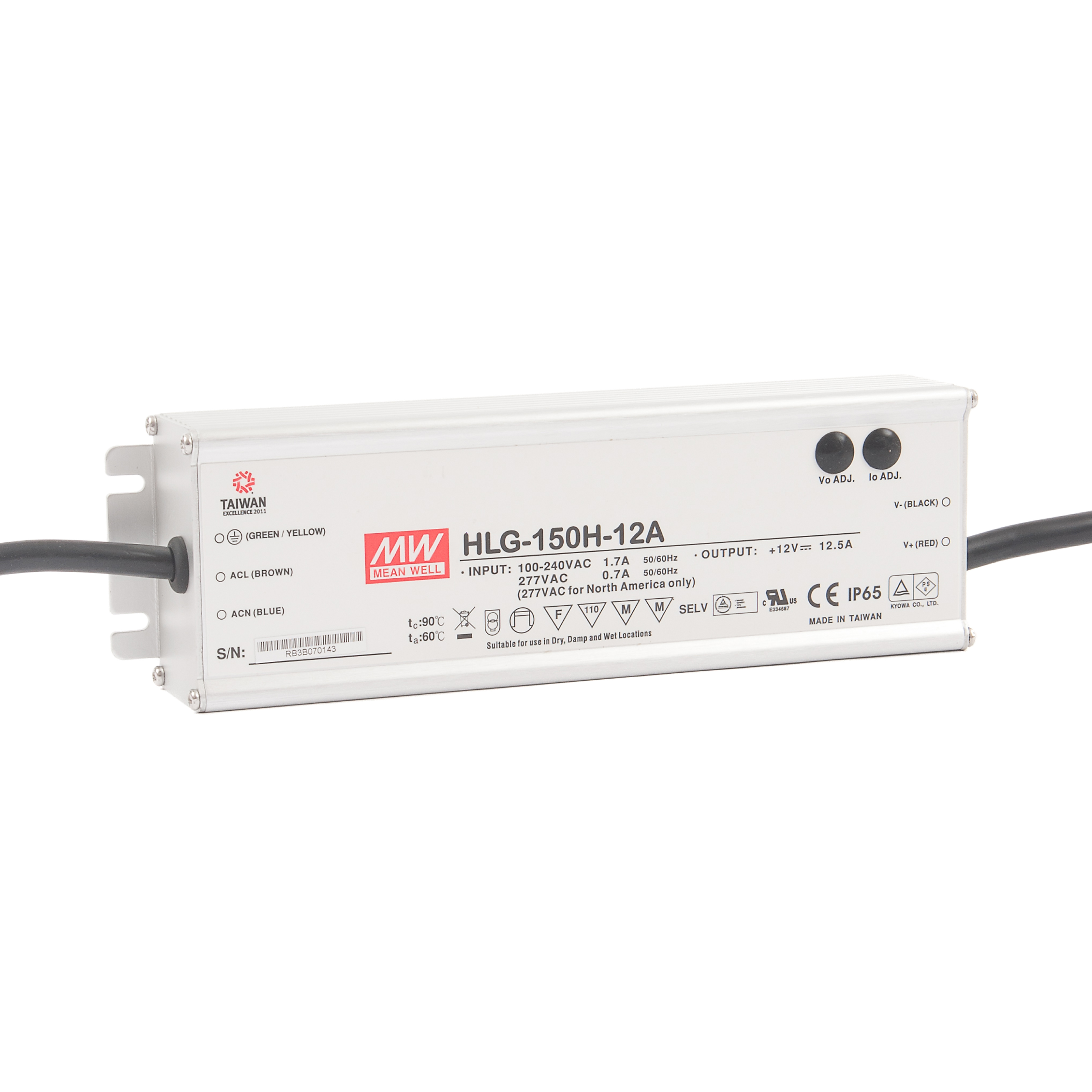 AC-DC, 150Вт, IP65, вход 90…305В AC, 47…63Гц/127…431В DC, ККМ, выход 12В/12.5А, изоляция 3750В AC, в кожухе 228х68х39мм, -55…+70°С, подстройка тока/напряжения
