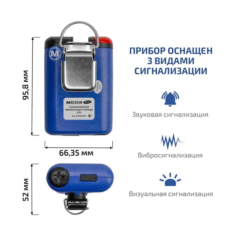 Газоанализатор (газосигнализатор) монооксида углерода индивидуальный МЕГЕОН 08107 – портативный измеритель концентрации угарного газа. Внесён в ГРСИ под номером 93332-24. Прибор обладает дисплеем с подсветкой для работы в местах с недостаточной освещённостью, визуальной, звуковой и вибро-оповещением превышения заданных уровней, памятью максимально измеренного значения и функцией автоматического отключения для экономии заряда батареи. Перечисленные качества сделают повседневную эксплуатацию простой и удобной. Элементом питания служит 3,7В аккумулятор формата 754060P. Для ношения предусмотрена стальная клипса с кольцом, она позволит носить анализатор на шнурке или карабине. Степень пыле-влаго защищённости IP65. Есть возможность самостоятельной калибровки. Будет чрезвычайно полезен во многих сферах деятельности. Функционал по достоинству оценят как профессионалы, так и начинающие пользователи.