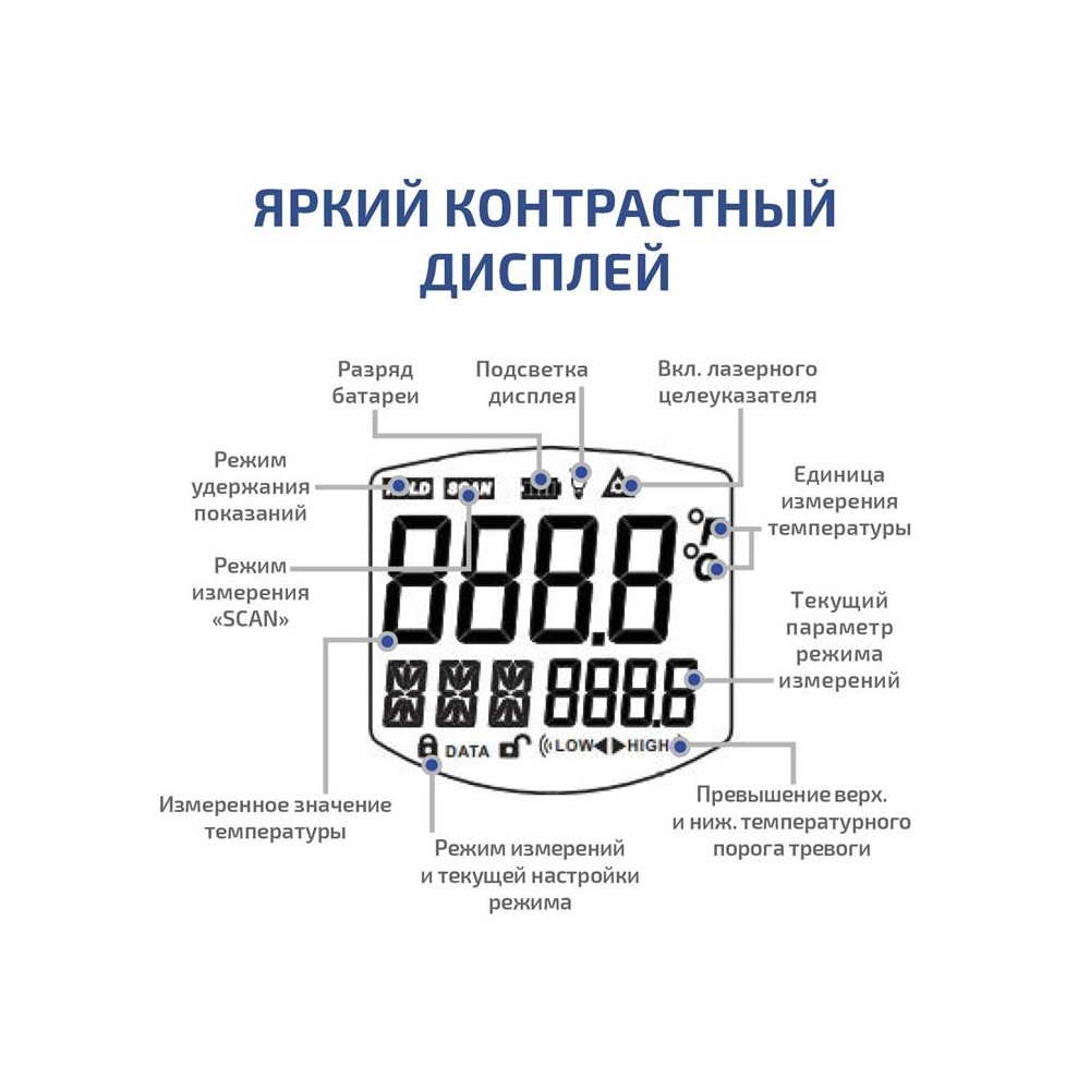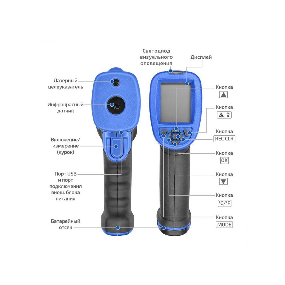 - Удобная рукоятка и кнопка измерения
