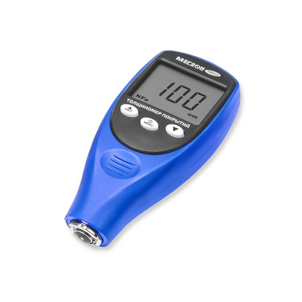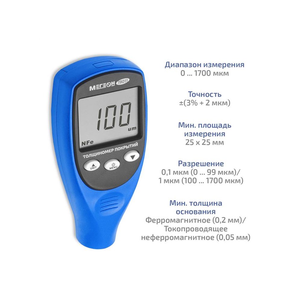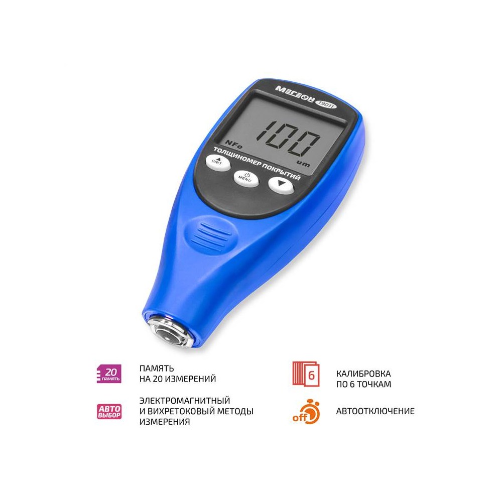 Толщиномер покрытий МЕГЕОН 19011 предназначен для измерения толщины лакокрасочных, полимерных, цинковых, медных и других покрытий на основаниях из чёрных и цветных металлов. В приборе комплексно реализовано два метода измерения – электромагнитный и вихретоковый. Выбор режима выполняется автоматически в зависимости от типа металла под покрытием – ферромагнитного или неферромагнитного. Первым включается электромагнитный режим, а при отсутствии в пределах видимости ферромагнитного материала прибор переключается на вихретоковый режим для обнаружения неферромагнитного основания. В обоих случаях толщиномер измеряет расстояние от датчика до металлического основания. С его помощью можно измерить: На железе – толщину слоя диэлектрика, токопроводящего немагнитного материала или их суммарную величину при комбинированном нанесении. Например, слой цинка на неокрашенном кровельном железе или общую толщину цинка с дополнительно нанесённым полимером. На цветных металлах – толщину покрытия из диэлектрических материалов. К примеру, слой краски на алюминиевом листе. Список можно дополнить полиэтиленовой плёнкой, фольгой, скотчем, бумагой и другими тонкими немагнитными материалами при наложении их на подходящую подложку. Результаты отображаются на контрастном жидкокристаллическом дисплее, сохраняются в память для последующего анализа и обрабатываются функциями вычисления максимального, минимального и среднего значений. Для повышения точности в программном обеспечении предусмотрена пользовательская калибровка по 6 точкам или по своему образцу, а в комплекте поставляется калибровочный набор. Толщиномер МЕГЕОН 19011 может успешно применяться для контроля качества окраски металлоконструкций на производстве и в строительстве, для поиска следов ремонта кузовных деталей при оценке автомобилей и во многих других сферах.
