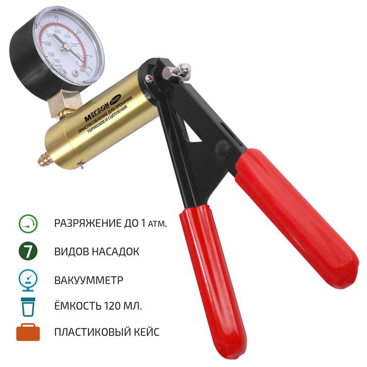МЕГЕОН 24001 - новинка в модельном ряду профессиональных приспособлений для обслуживания автомобильной и мотоциклетной техники и иных агрегатов, а также вакуумного и гидравлического оборудования. Инструмент значительно упростит работы по дегазации тормозной системы, привода сцепления и позволит откачать гидрожидкости из бачков главных цилиндров, проверить вакуумные включатели и датчики. В настоящее время уже активно применяется на станциях технического обслуживания и сервисных центрах по ремонту транспортных средств. Полноценная комплектация не требует дополнительных доработок и улучшений. Благодаря простоте конструкции достигается максимальное удобство при эксплуатации изделия. Противоударный кейс надёжно удерживает каждый элемент и предотвратит поломки при хранении и транспортировке. Набор найдёт широкое применение у профессионалов и любителей, а также станет недорогим, но очень нужным подарком.
